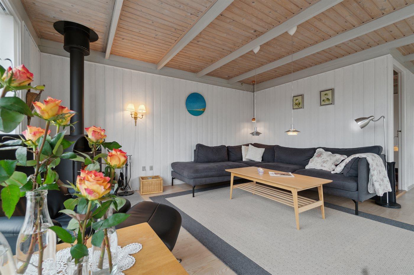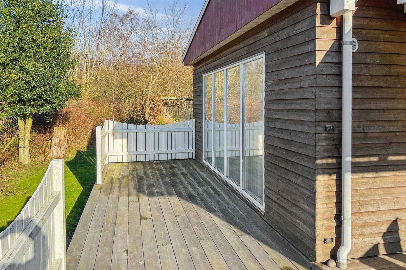 Husets ydervægge er beklædt med træværk, så huset har en helt speciel karakter. Der findes åben og fin, overdækket terrasse, der indbyder til timer i det fri, hvor du kan nyde solen, en god bog er eller udsigten til de nære omgivelser.