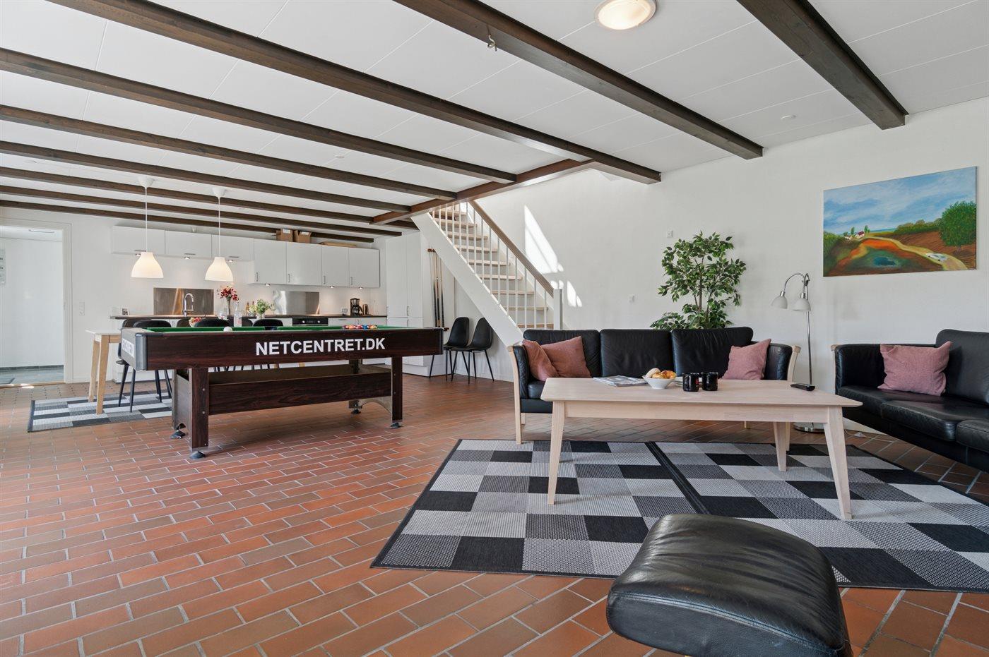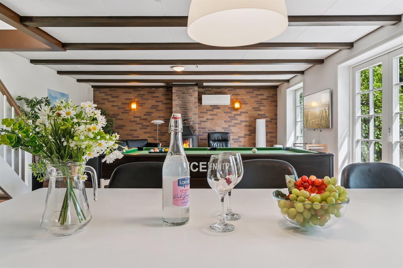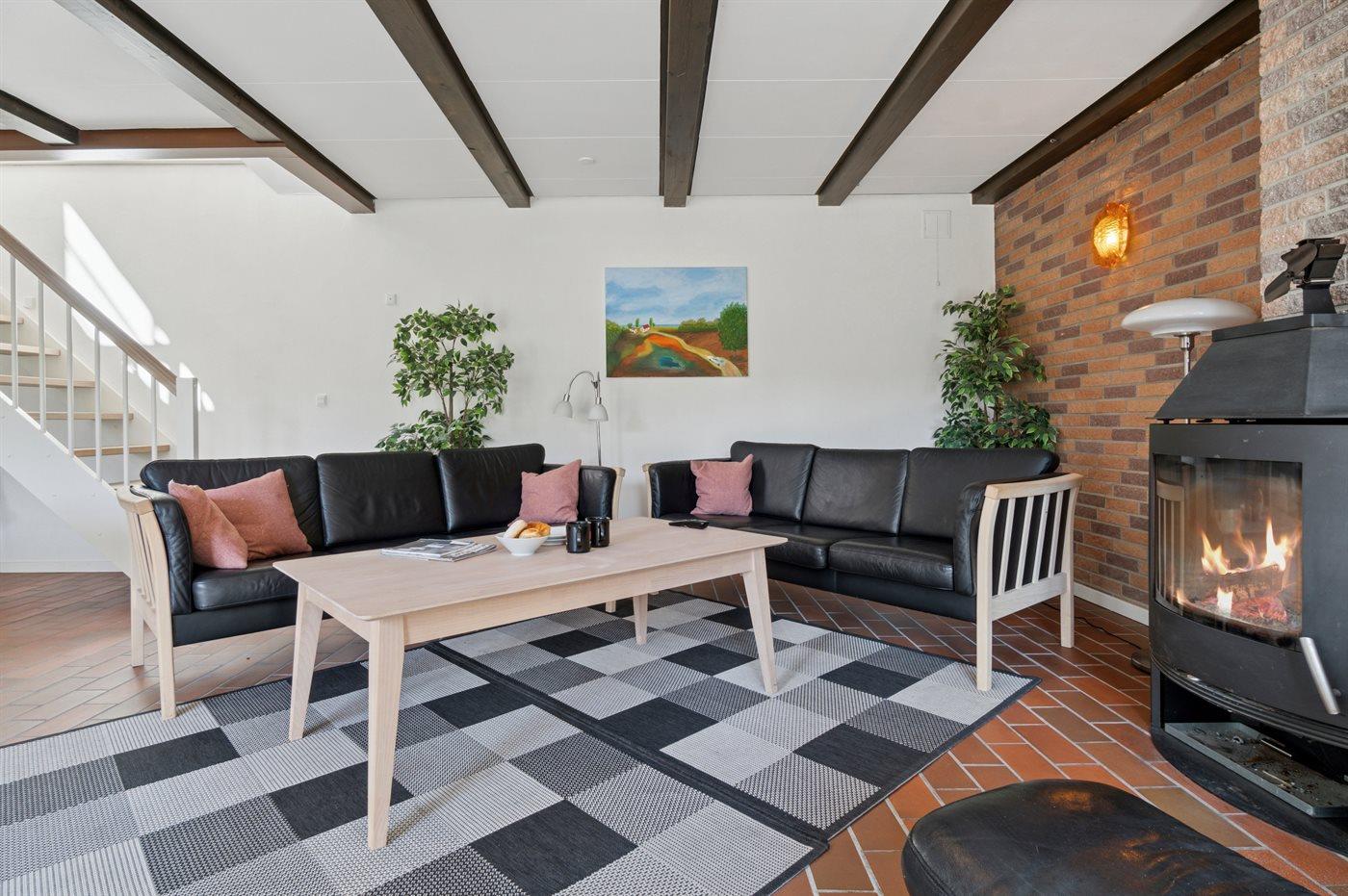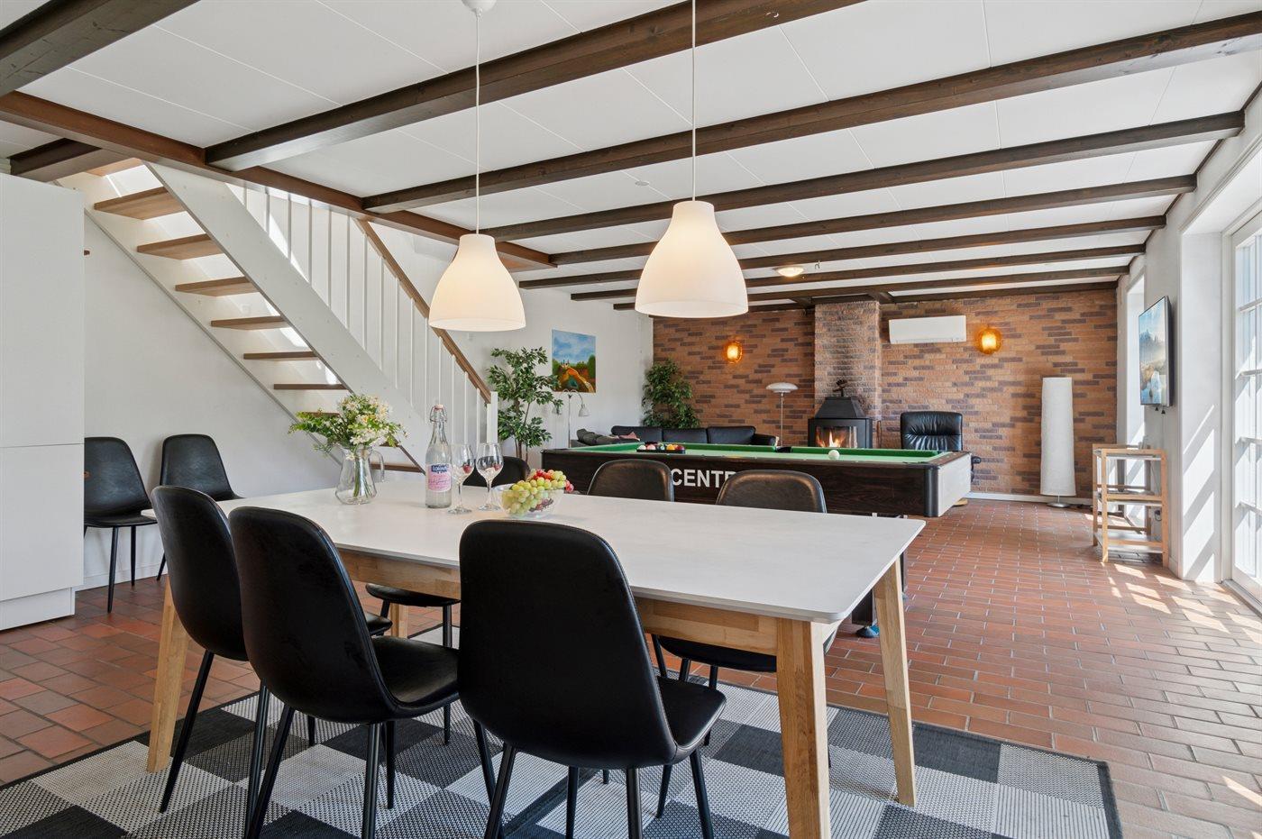 Husets midtpunkt og naturlige samlingssted for hele familien er den store, kombinerede opholds- og spisestue samt det veludstyrede køkken.