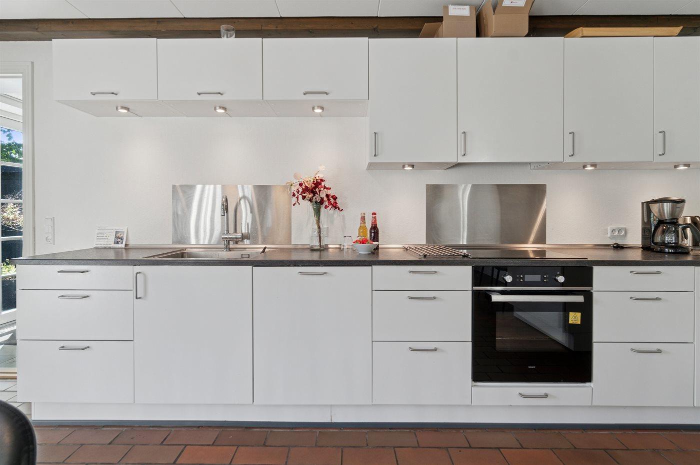 Køkkenet er udstyret med 1 køleskab. Der er 4 induktionskogeplader, varmluftovn samt opvaskemaskine.