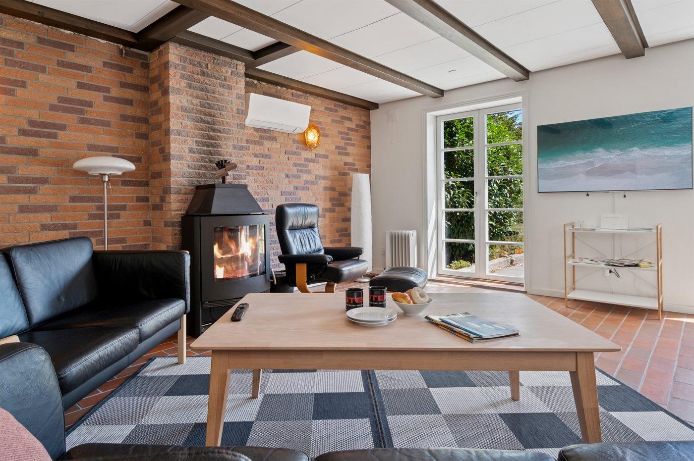 Ferielejligheden er lys og rummelig med en smagfuld indretning. Renoveringen har bevaret de synlige træbjælker i loftet, som bidrager til den hyggelige stemning.