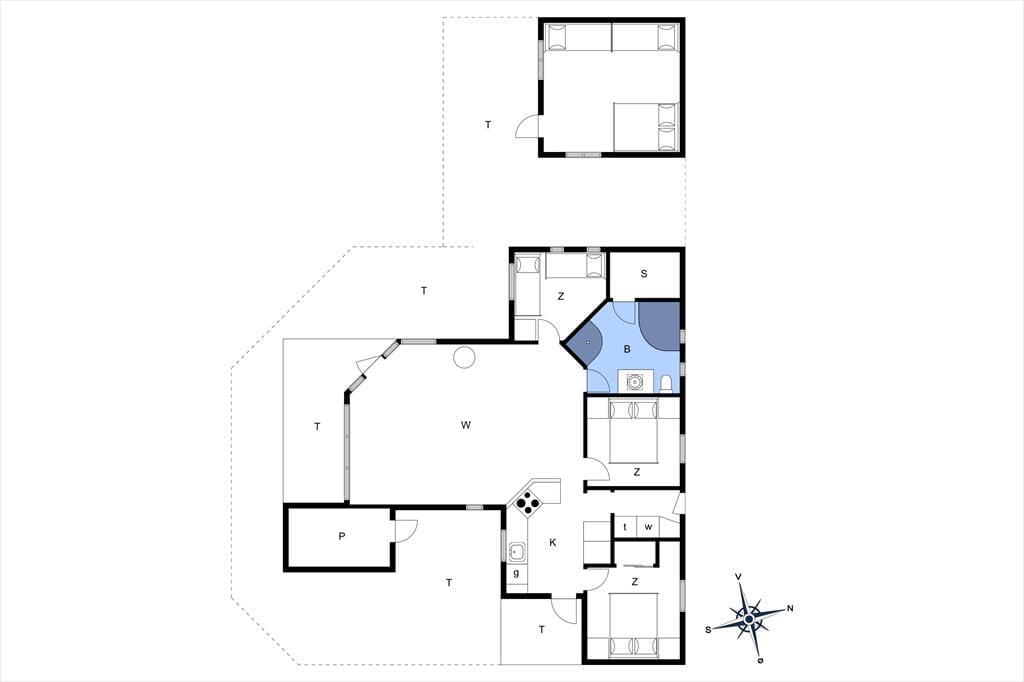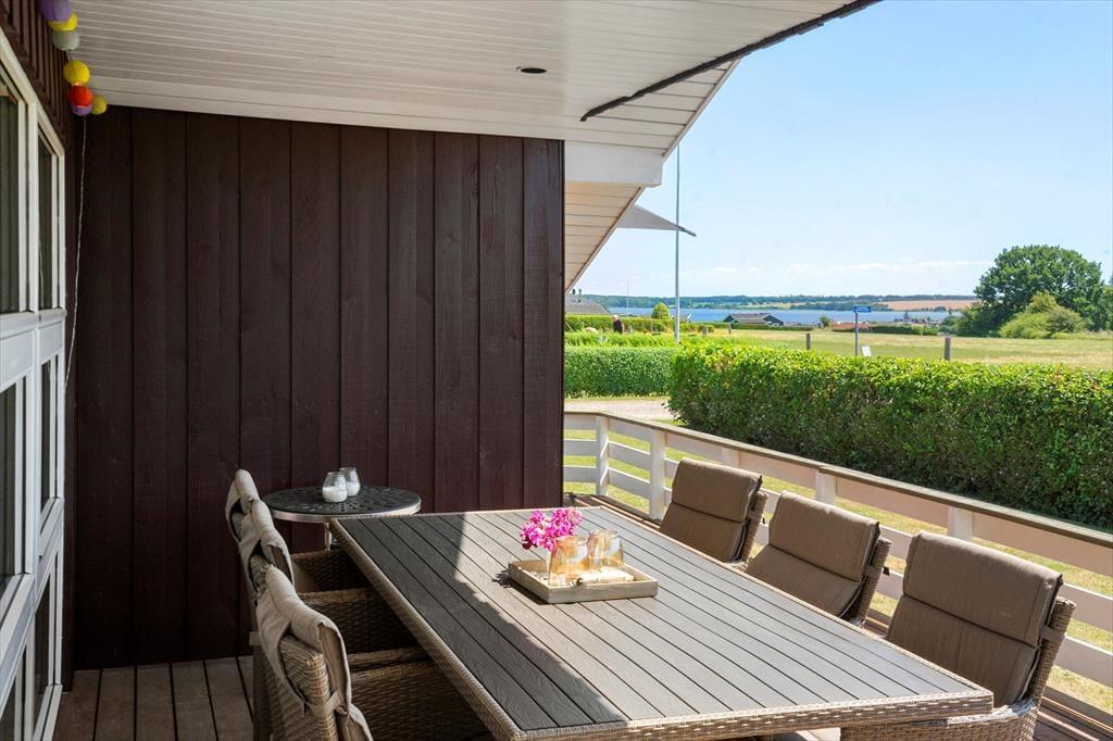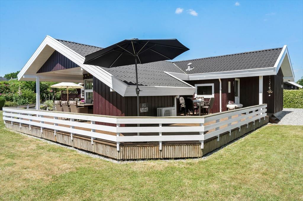Huset er omkranset af en dejlig stor, og let forhøjet træterrasse, der indbyder til afslapning på de gode dage og hyggelige aftener udendørs. Der er direkte udgang fra stuen til terrassen. Det vil være ideelt at tilberede et aftensmåltid på husets grill, og nyde det i de gode havemøbler. På terrassen er også parasol og havehynder, så man kan let gøre det komfortabelt at opholde sig på terrassen. Ved huset er også to solsenge, så når solen skinner er det let at komme helt ned i feriegear i den aflukkede have.
