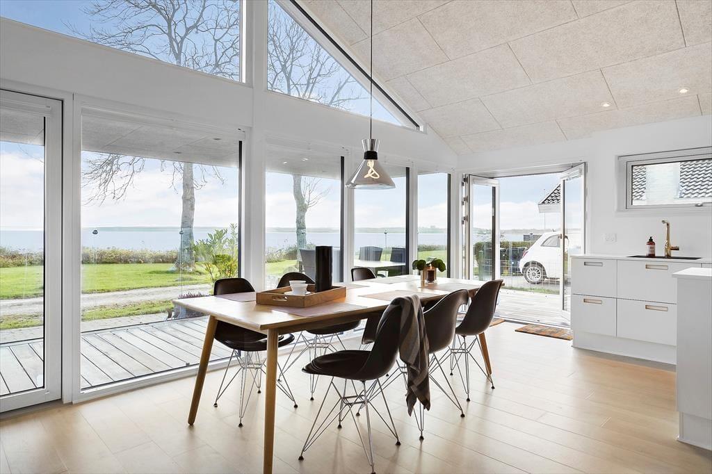 Med kun 30 meter til stranden bliver det svært ikke at sidde mange timer i det lyse køkken/alrum og nyde udsigten. Dette dejlige rum er husets hjerte, hvor I kan samles og hygge jer om madlavning, spille spil eller slappe af i sofaen. Som resten af huset er køkkenet lyst og meget stilrent indrettet. Her er alt hvad du skal bruge til at lave mad, og god plads til at sidde omkring spisebordet, hvorfra udsigten kan nydes gennem de store vinduer mod havet.