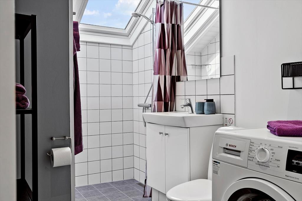 Husets badeværelse er med brus og toilet.