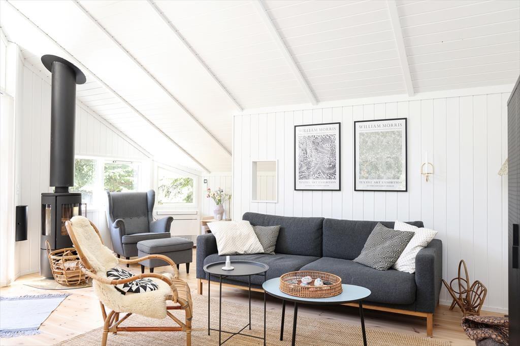 Den lyse og rummelige stue med loft til kip har vinduer på alle sider, så du fra det åbne køkken kan følge med både indendørs og udendørs, mens du sætter morgenkaffen over. Ved spisebordet kan I indtage morgenmaden og senere på dagen sidde og spille et spil. I den bløde sofa eller alkoven ved siden af kan du slappe af med en god bog. Har I været på en god travetur langs stranden, er det rart med en tur i sauna og spabad.