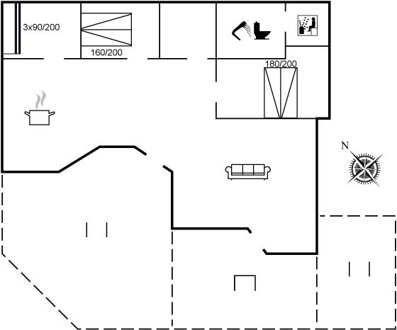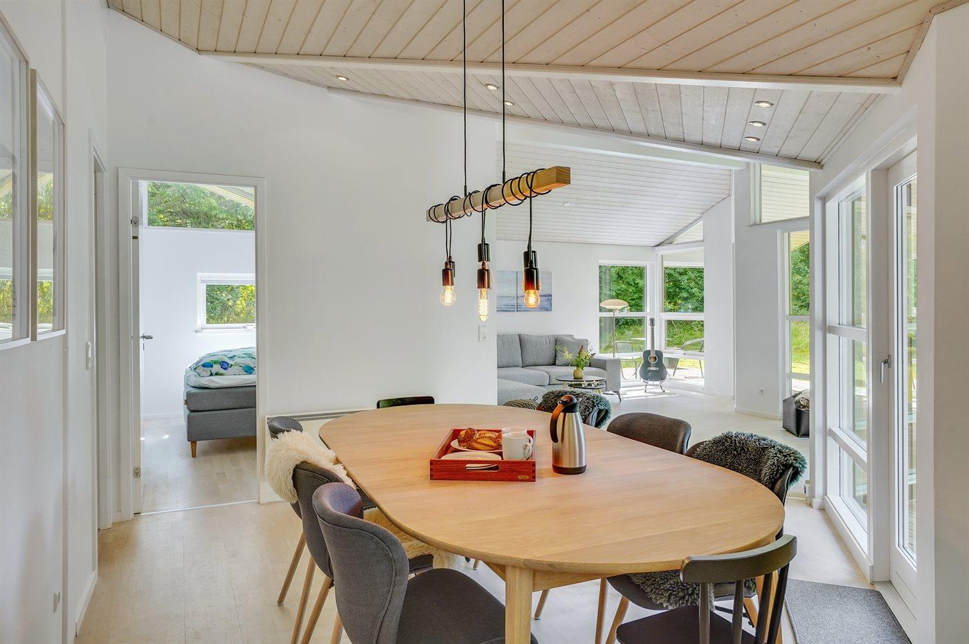 Dette sommerhus, hvor der er masser af lys og loft til kip i alle rum, er det perfekte valg til en god ferie. Køkkenet, spisepladsen og opholdsstuen ligger i åben forbindelse og er dermed det naturlige samlingspunkt for hygge og samvær. Herfra er der udgang til en stor, delvis overdækket træterrasse. Huset er indrettet med 3 værelser, hvoraf de to er med dobbeltsenge og det tredje er med en køjeseng i 3 etager (bedst egnet til børn og unge).