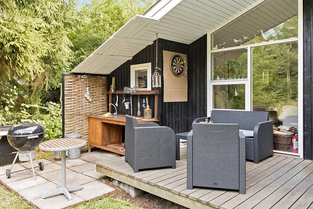 Udendørsområdet er en sand perle. Den store terrasse, delvist overdækket, inviterer til hyggelige grillaftener og afslapning i solen. I haven finder du et charmerende orangeri, hvor loungemøbler og varmelamper gør det til det perfekte sted at nyde en kop kaffe eller en stille aftenstund, uanset vejret.