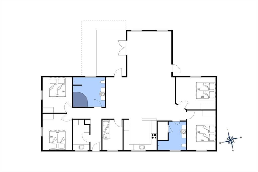 Sommerhuset har fire soveværelser med dobbeltsenge og et værelse med køjesenge, hvilket gør det ideelt til både voksne og børn. Alle soveværelser er udstyret med TV, så alle kan nyde deres yndlingsprogrammer i privatlivet. Værelserne er rummelige og lyst indrettede, og med bløde senge og hyggelige detaljer sikres en god nats søvn for alle.