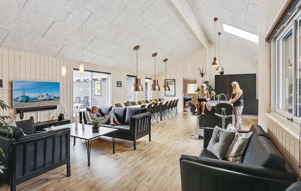 Arkitekttegnet luksushus opført i de bedste materialer. Huset har otte gode soveværelser i tre sektioner, hver sektion med separat badeværelse. Dette giver luft og plads at nyde ferien flere familier sammen. Centralt i huset findes et stor åbent køkken/alrum med et lækkert køkken, skabt til at tilberede maden til husets mange gæster. I alrummet er der brændeovn, en hyggelig sofagruppe og tv med tilhørende stor tv-pakke. I husets aktivitetsrum er der rig mulighed for aktiviteter for alle aldre. Her er både pool/billard, bordfodbold, dart, bordtennis, bar med køleskab og en sofagruppe med tv og Playstation4. Her er også aktiviteter for de yngste på to hemse. Den ene med sovepladser, den anden med sækkestole, legetøj og tv med DVD. Begge hemse har tre sovepladser. Der er musikanlæg i alle husets rum.