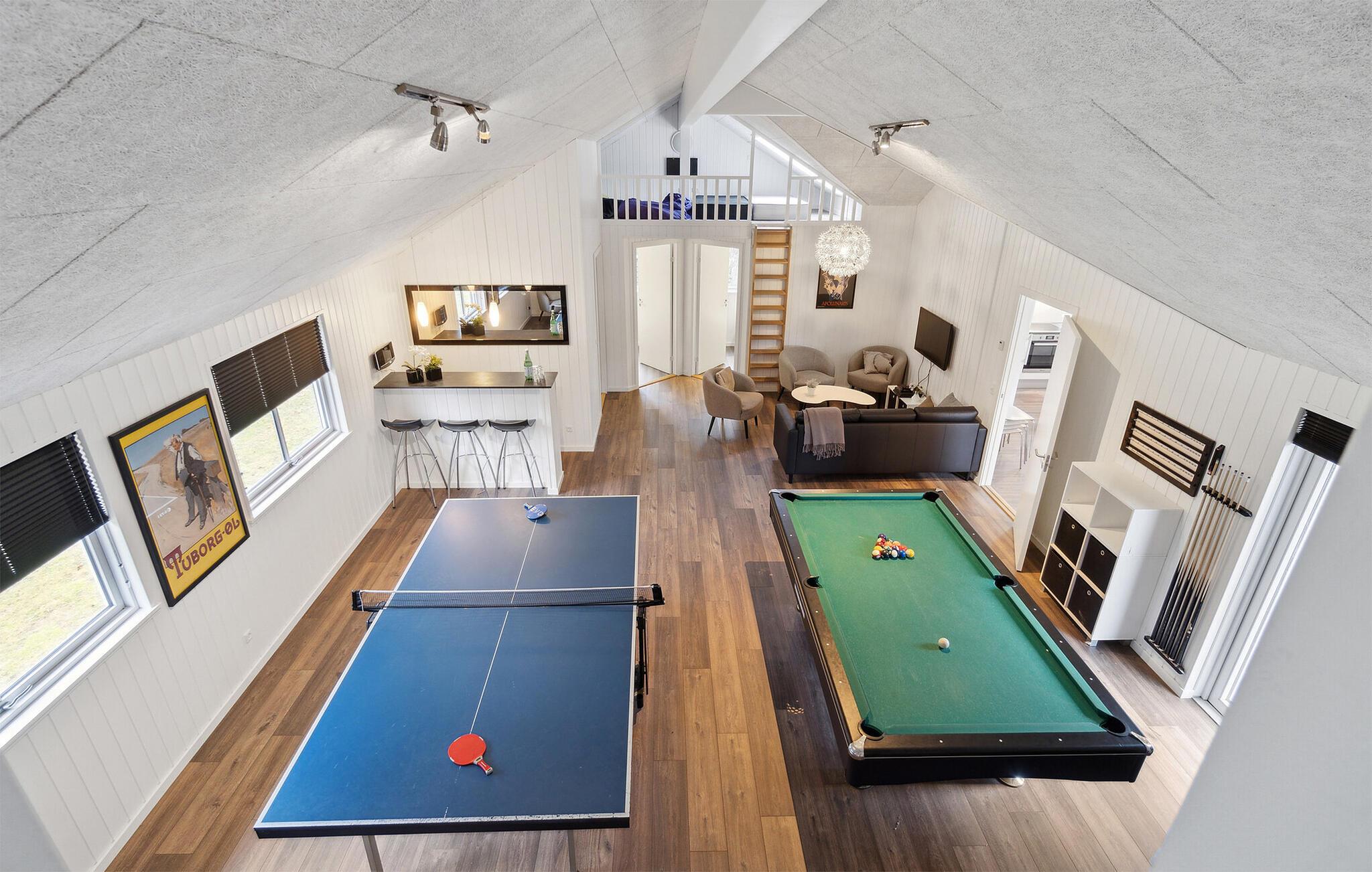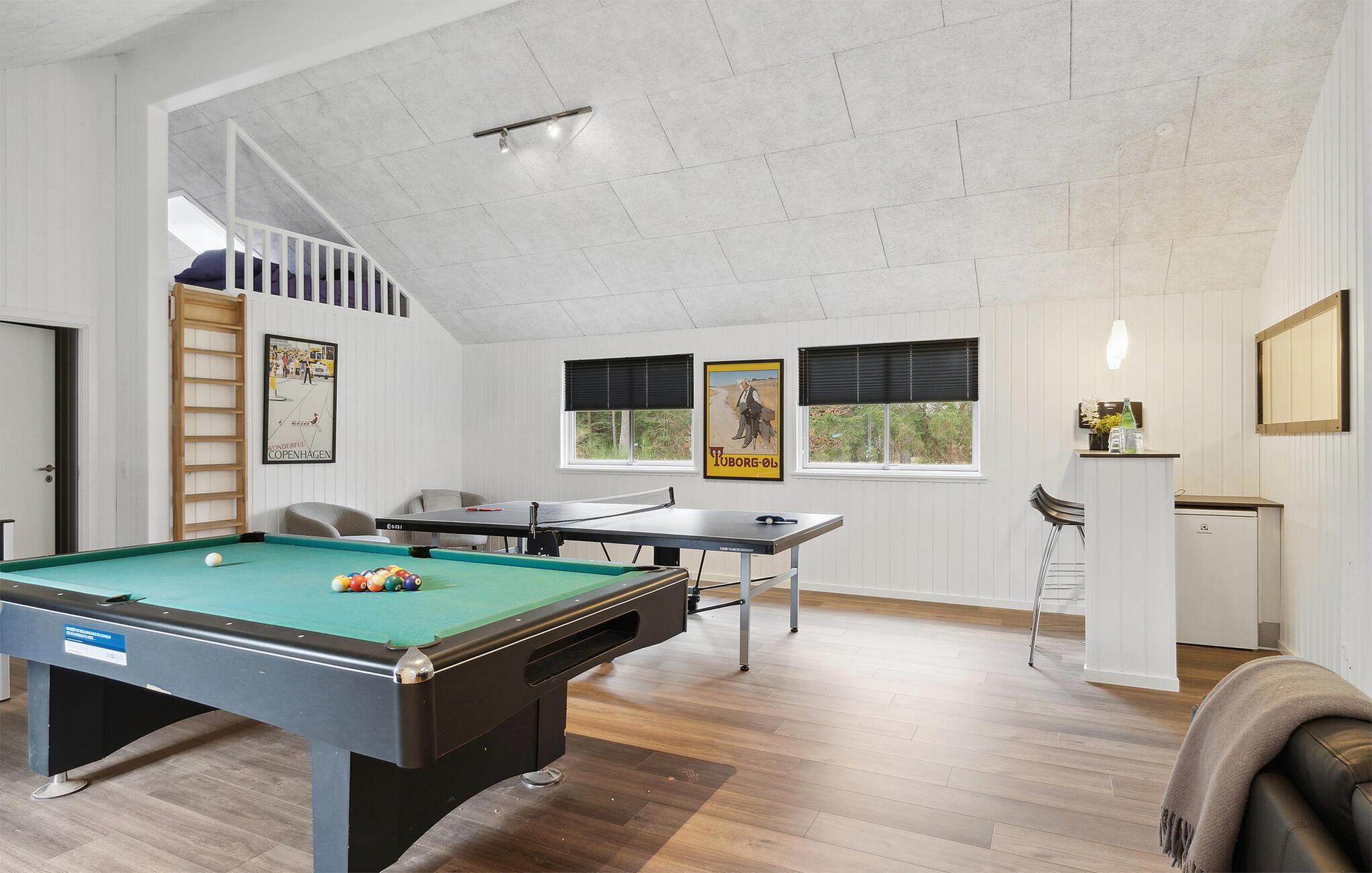 Oplev uforglemmelige feriedage i dette komfortable hus, der giver plads til flere familier. De lyse rum byder jer velkommen med højt til loftet og en indbydende indretning. Benyt det store, åbne køkken med kogeø, moderne udstyr og masser af opbevaringsplads til at tilberede måltider sammen. Sæt jer derefter ved det lange spisebord, og nyd hyggelige aftener, eller slap af i den komfortable opholdsstue på de bløde siddepladser. Benyt også det store aktivitetsrum med billard og bordtennis. Oplev desuden husets wellnessområde med sauna, spabad og en pool med rutsjebane.