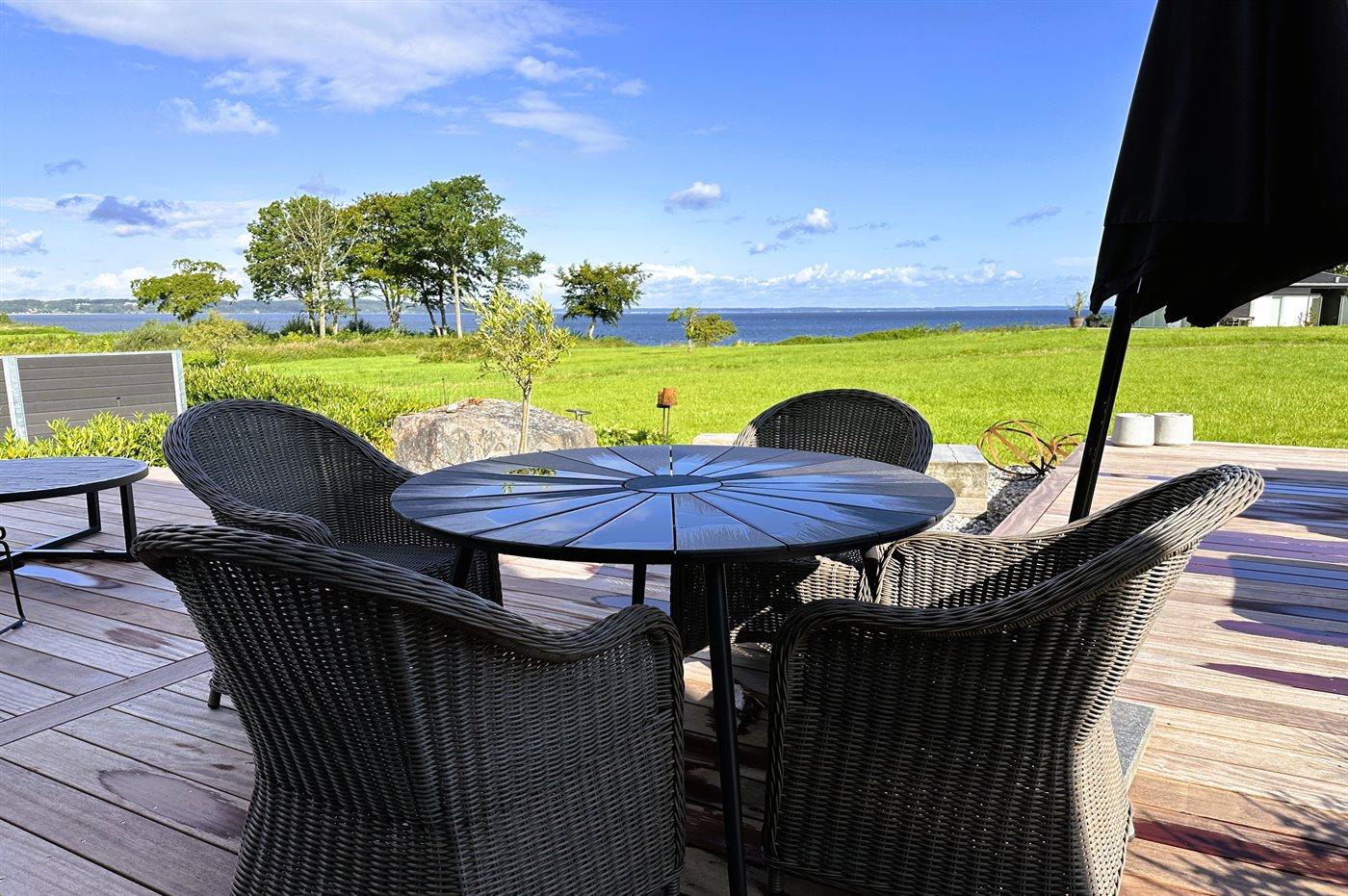 Dejlig stor terrasse foran huset, hvorfra der også er flot havudsigt, og flere terrasser rund om huset, så der altid kan findes både læ og sol.