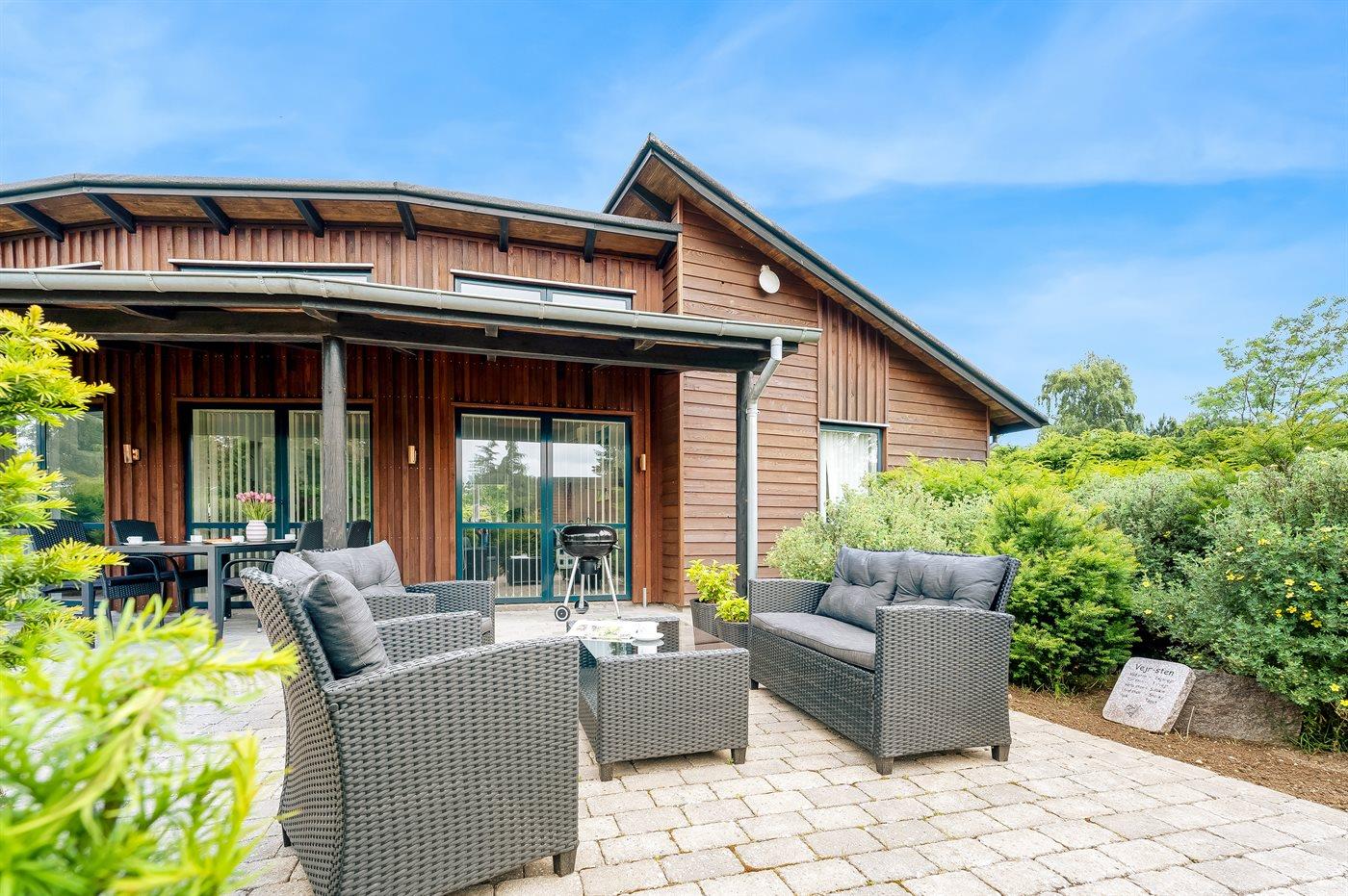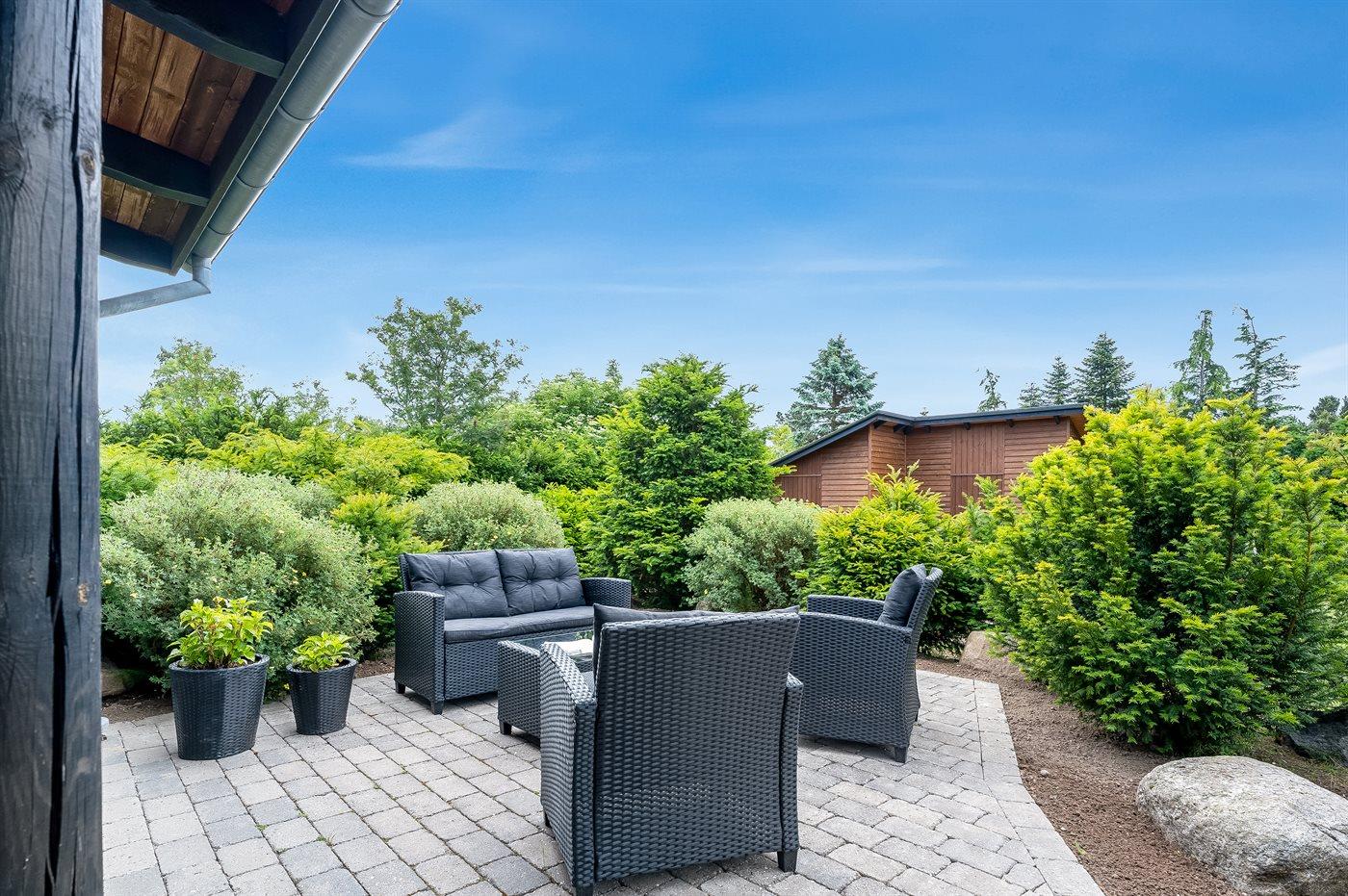 Ved huset er der en skøn have med overdækket terrasse og et åbent område, hvor der er en hyggelig morgenterrasse samt en stor terrasse med udsigt til haven. Her er grill til rådighed.