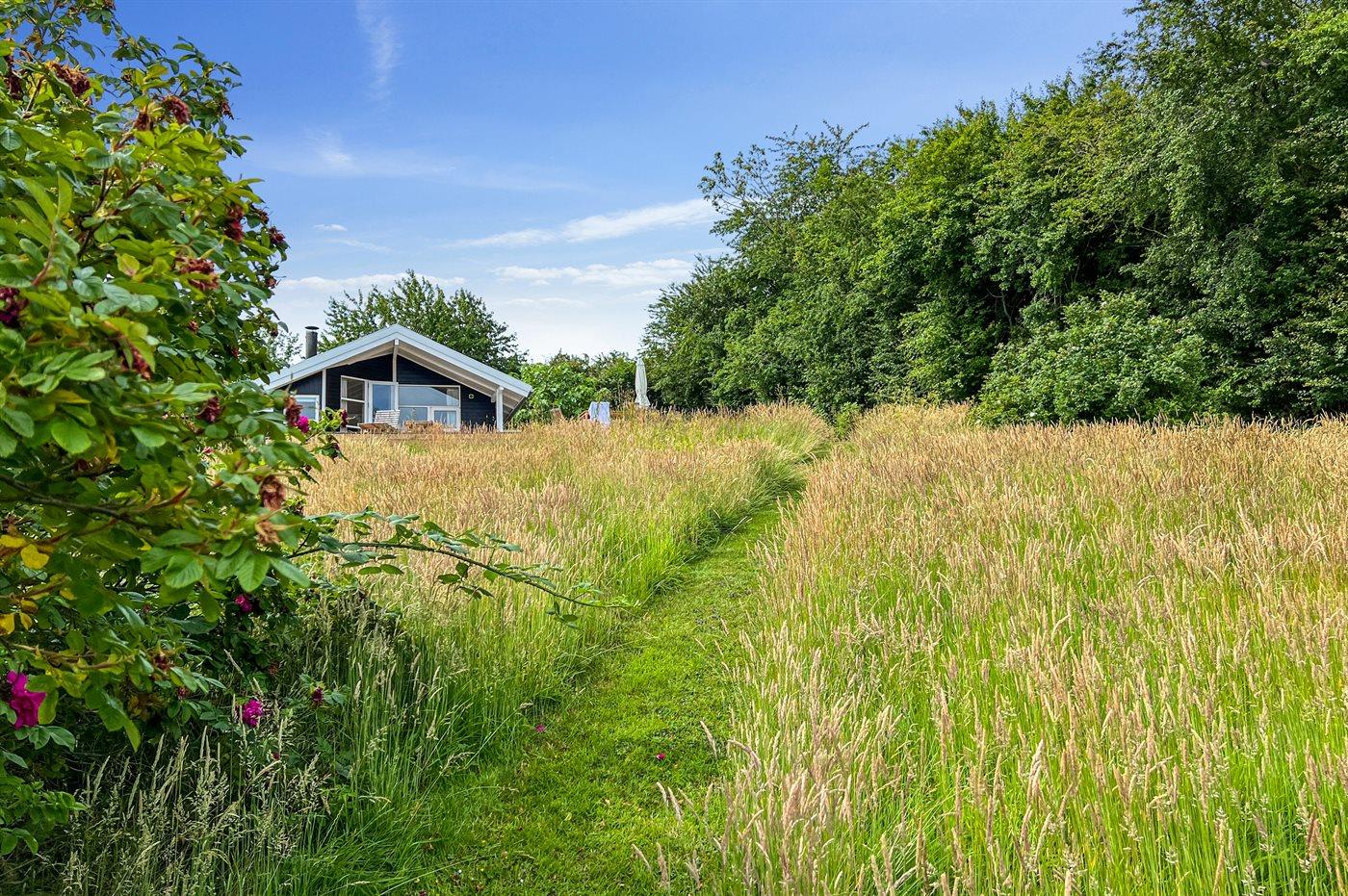Ferieboligen er beliggende på en 1692 m² stor naturgrund. Der er 350 m til havet. Nærmeste forretning er beliggende i en afstand af 5000 m. Til ferieboligen hører åbent terrasseareal. Desuden er der overdækket terrasse. Grill til rådighed. Der er installeret stik til opladning af elbil. Type 2 stik. Med 11 kW ladeeffekt. Parkering ved ferieboligen.