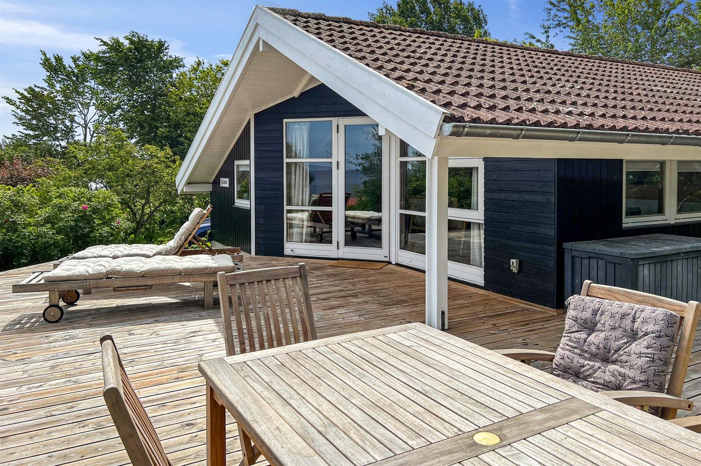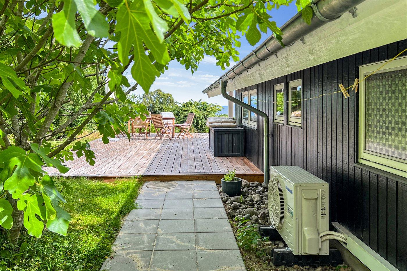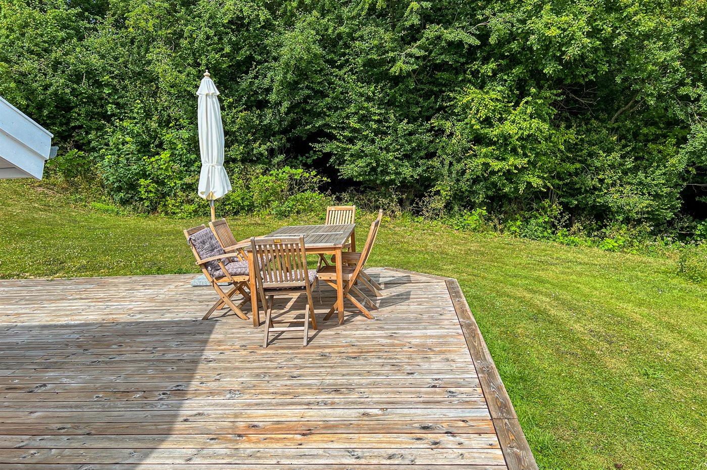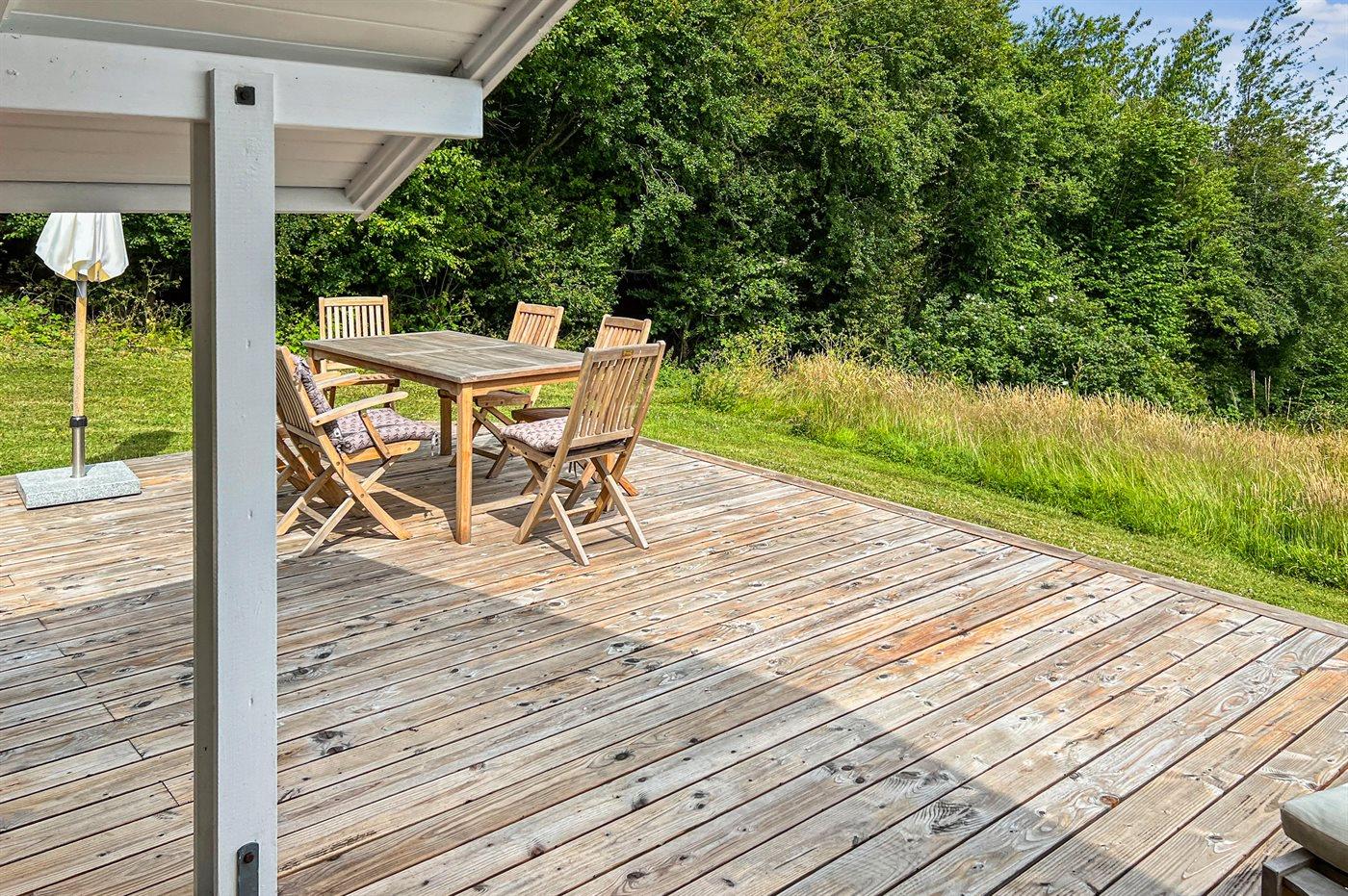 Træterrassen er så stor, at der er mulighed for at nyde morgensolen, men også for at nyde solen og timer i det fri senere på dagen, hvor man kan hygge sig med en god bog eller en kop kaffe i læ af huset.