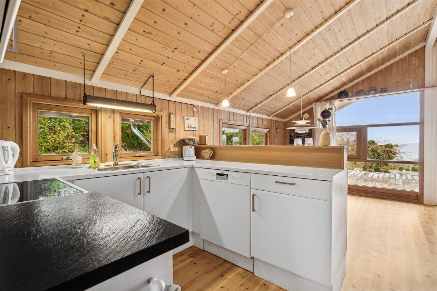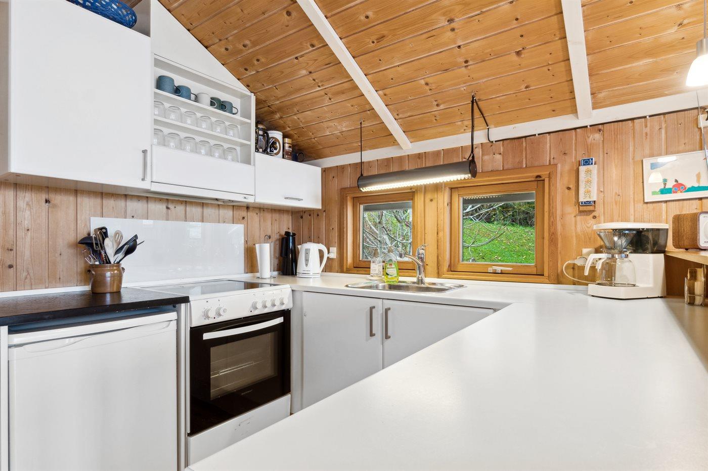 Køkkenet er udstyret med 1 køleskab. Der er 4 keramiske kogeplader, varmluftovn samt opvaskemaskine.