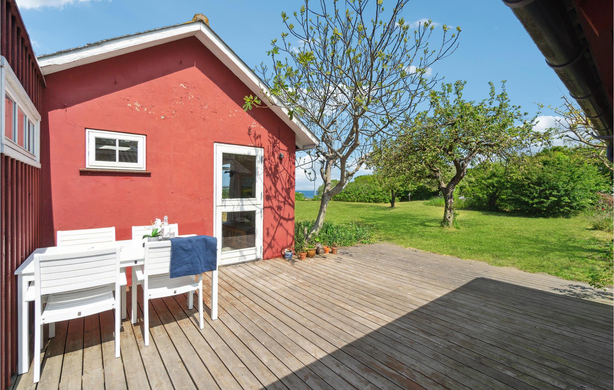 Charmerende rødt sommerhus ved havet med enestående havudsigt, træterrasse og hyggelige udhuse i Svaneke.
