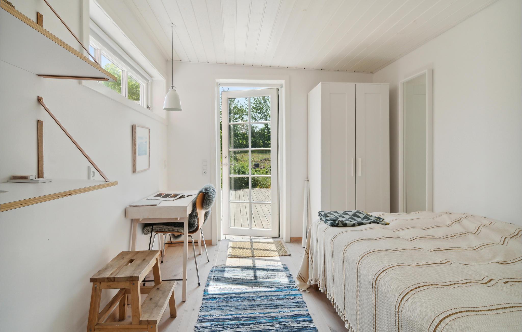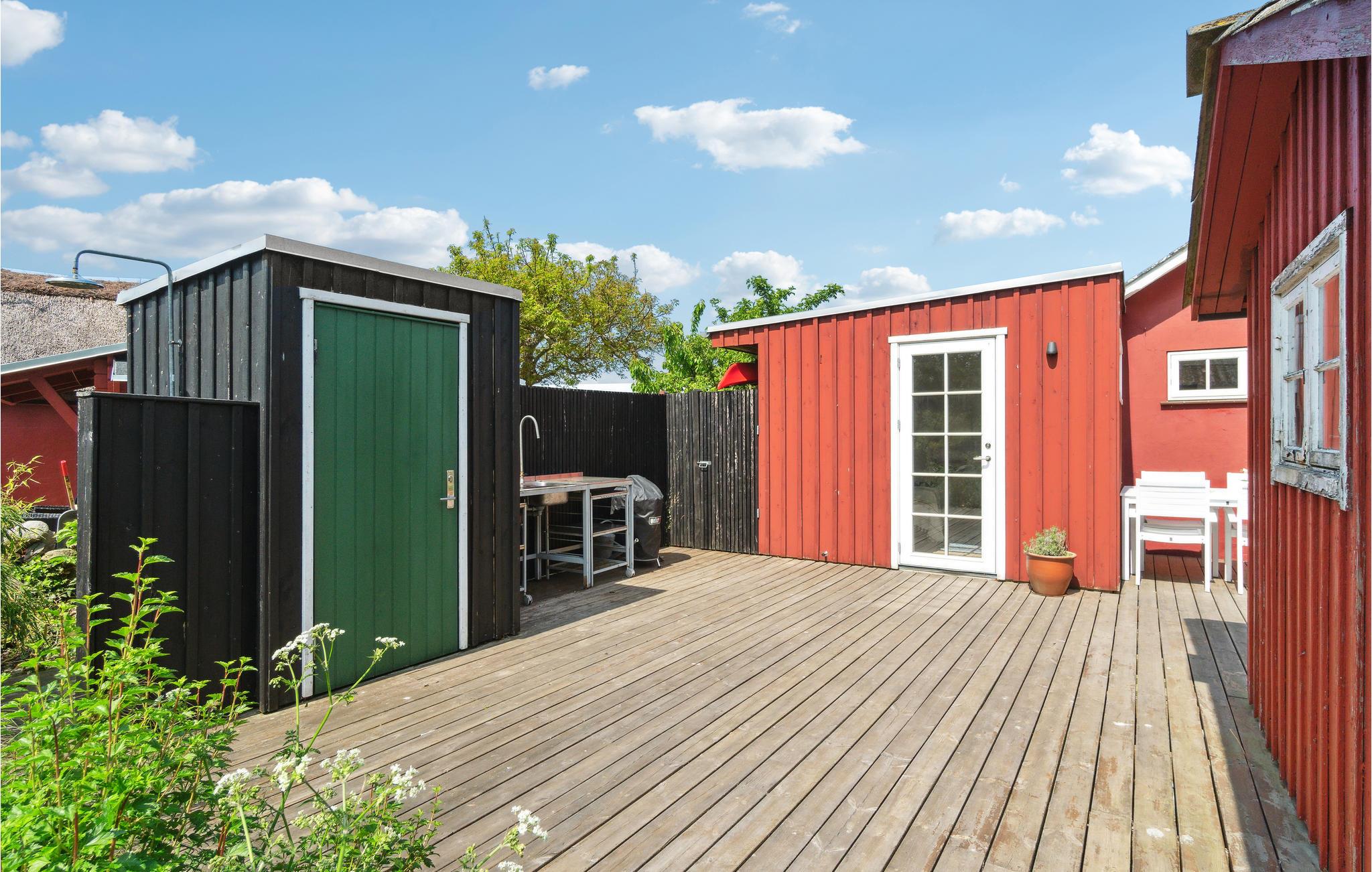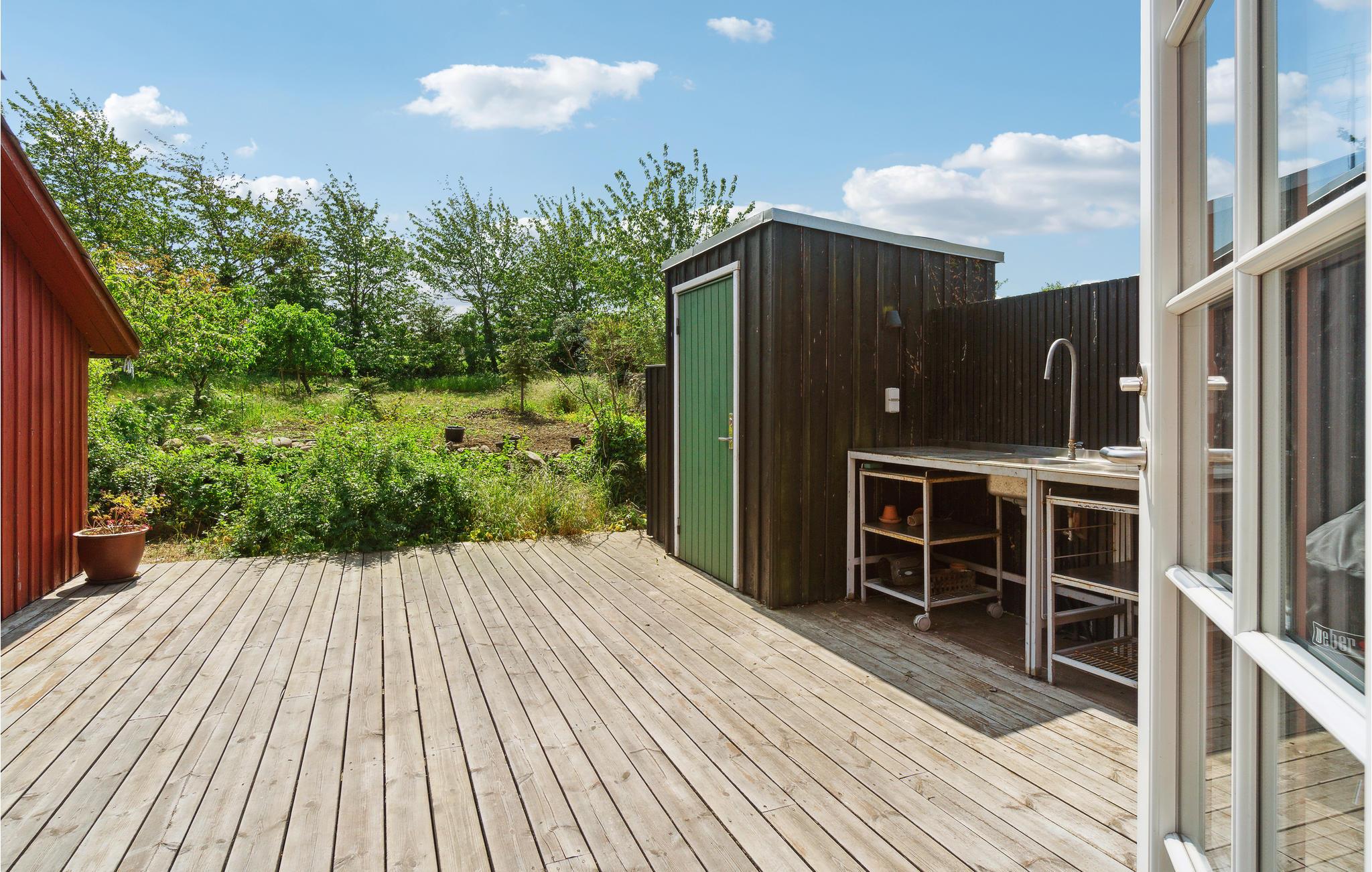 Det skønne sommerhus har en hovedbygning og to hyggelige udhuse, hvor I kan føle jer hjemme med jeres familie eller venner. En stor træterrasse forbinder hovedhuset med de to tilstødende udhuse, så I kan tilbringe jeres ferie sammen, mens I stadig nyder jeres privatliv. Fra hovedhuset har I en smuk havudsigt og kan spise jeres yndlingsretter sammen i den lyse stue eller slappe af i sofaen. Men bliv ikke bare i huset, I kan også nyde den smukke ejendom med mange hyggekroge. Dels er der udekøkken og grill til fælles middage på milde sommeraftener. Efter en forfriskende dukkert i havet kan I skylle jer under den udendørs bruser. En trampolin og andre legeredskaber inviterer jeres børn til at lege og boltre sig i haven.
