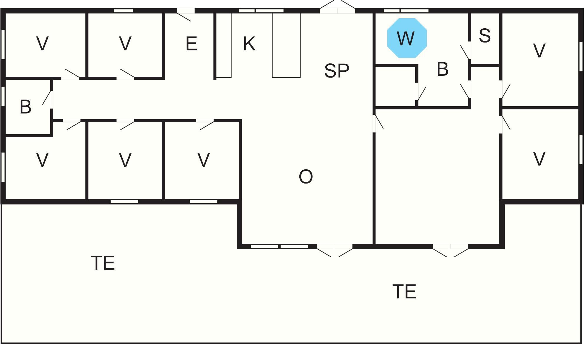 7 Soveværelser: (1DS)+(1DS)+(1DS)+(1DS)+(1DS)+(1S+2K)+(1S+2K)