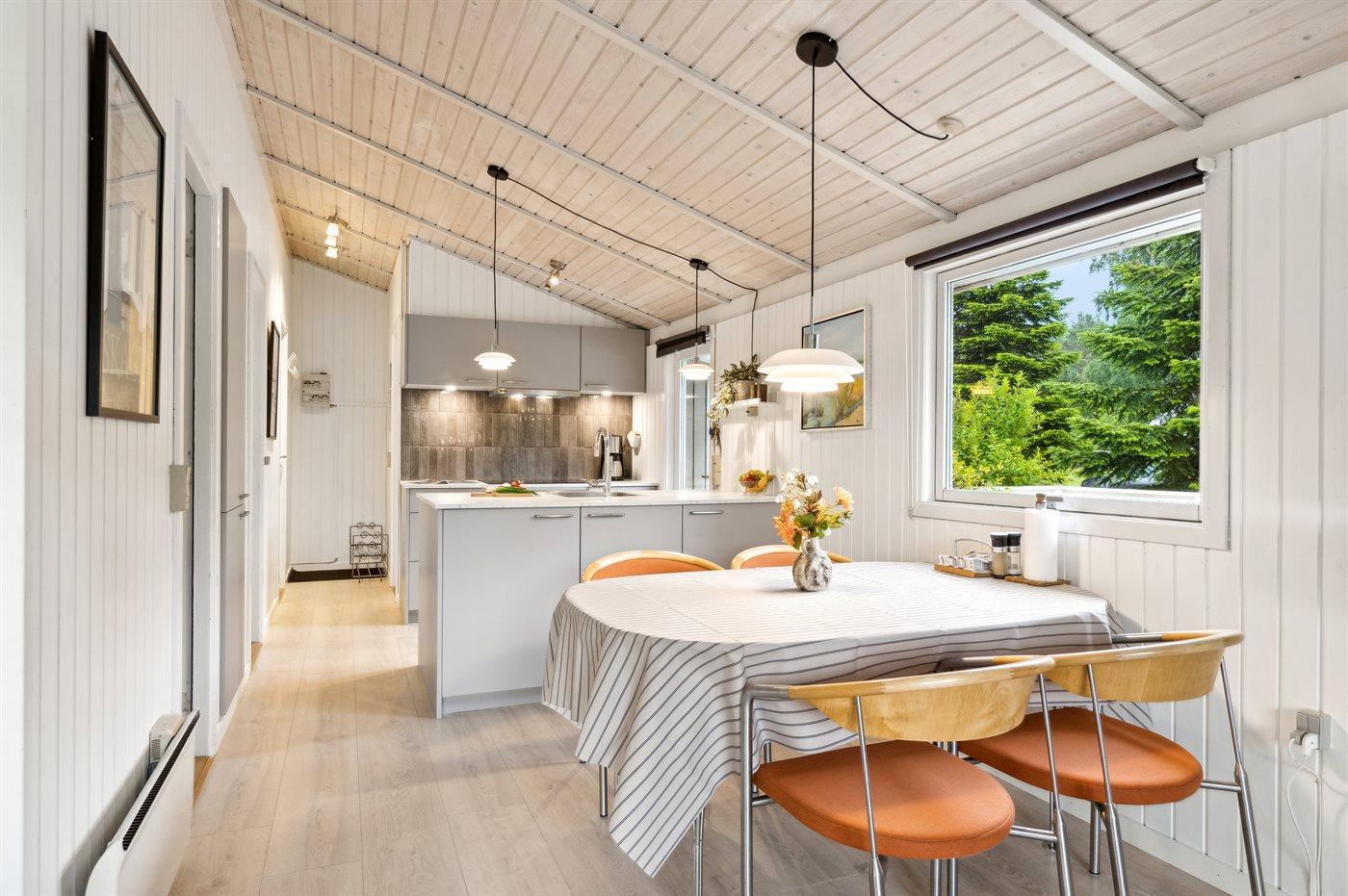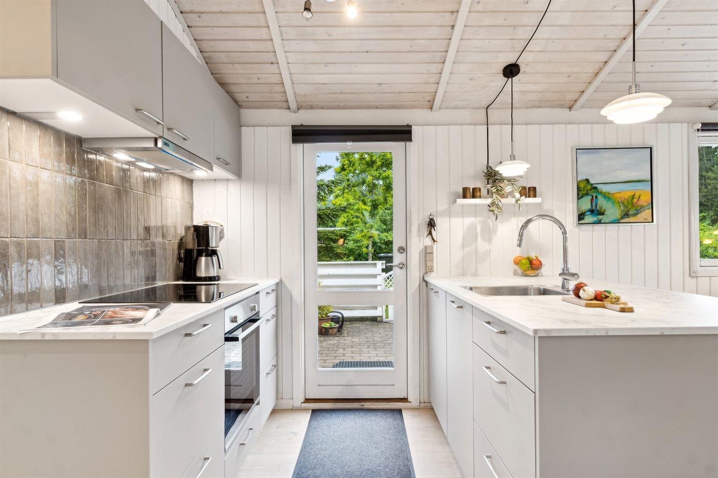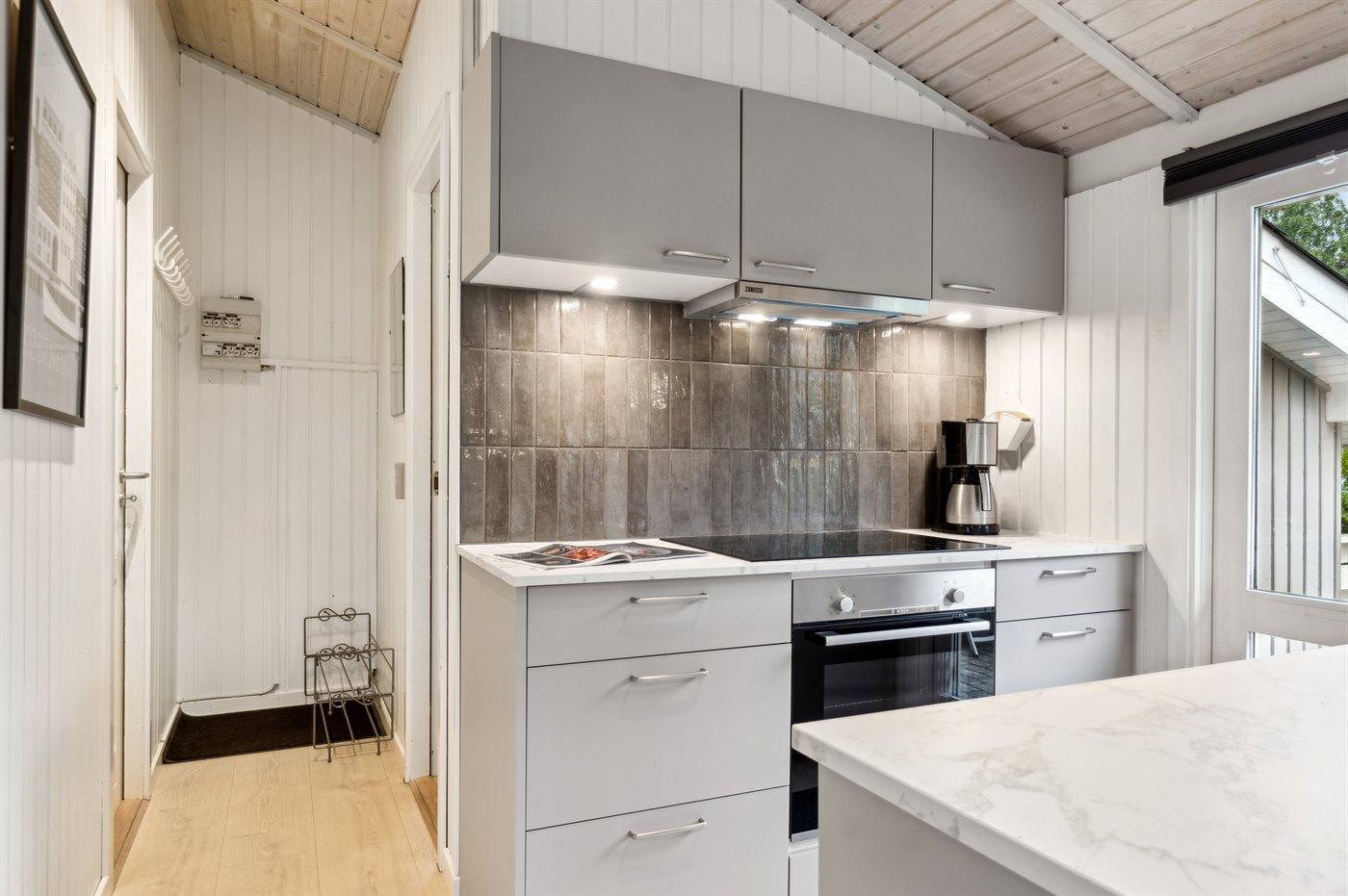 Køkkenet er udstyret med 1 køleskab. Der er 4 keramiske kogeplader, varmluftovn, mikrobølgeovn samt opvaskemaskine.