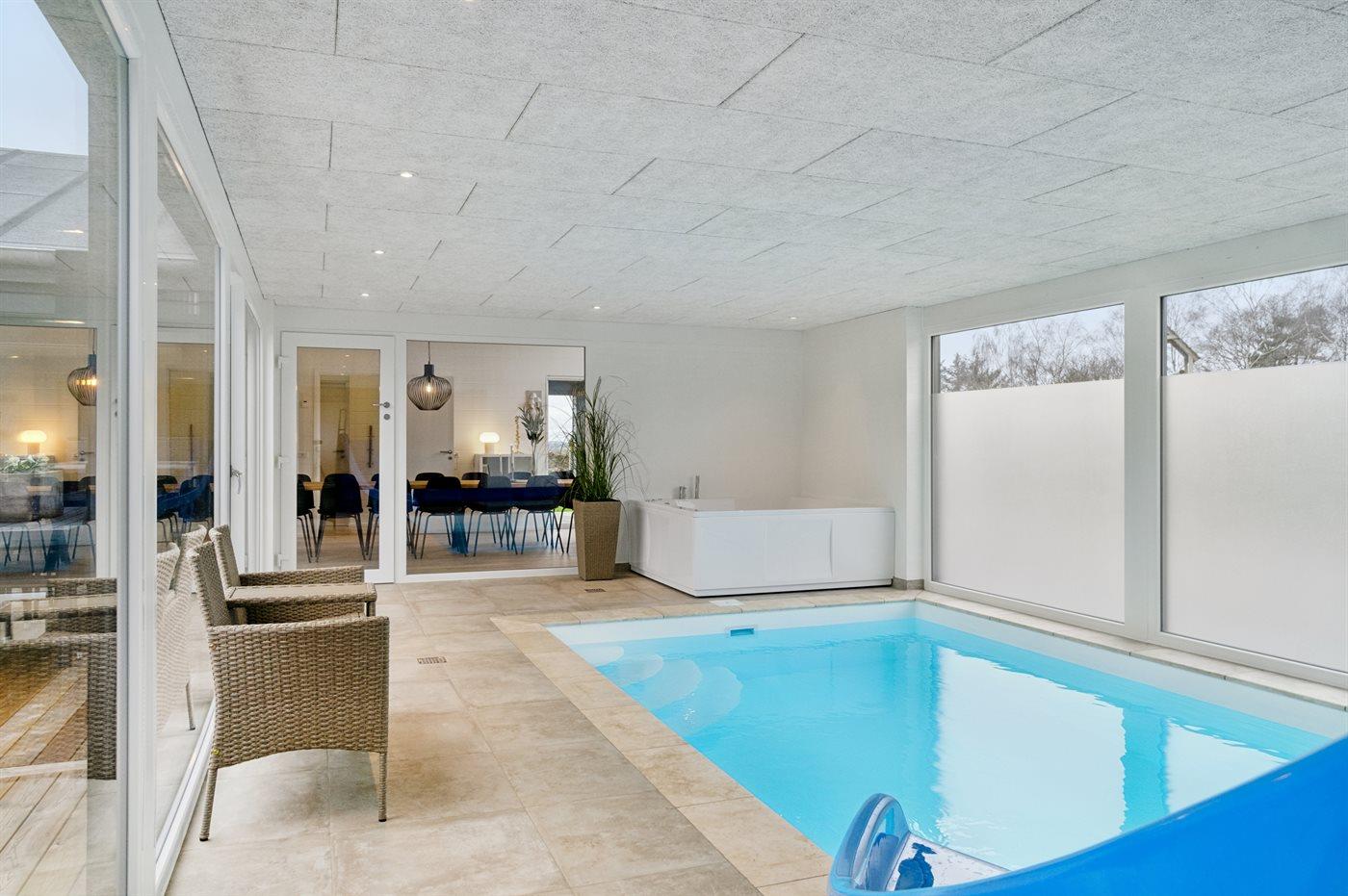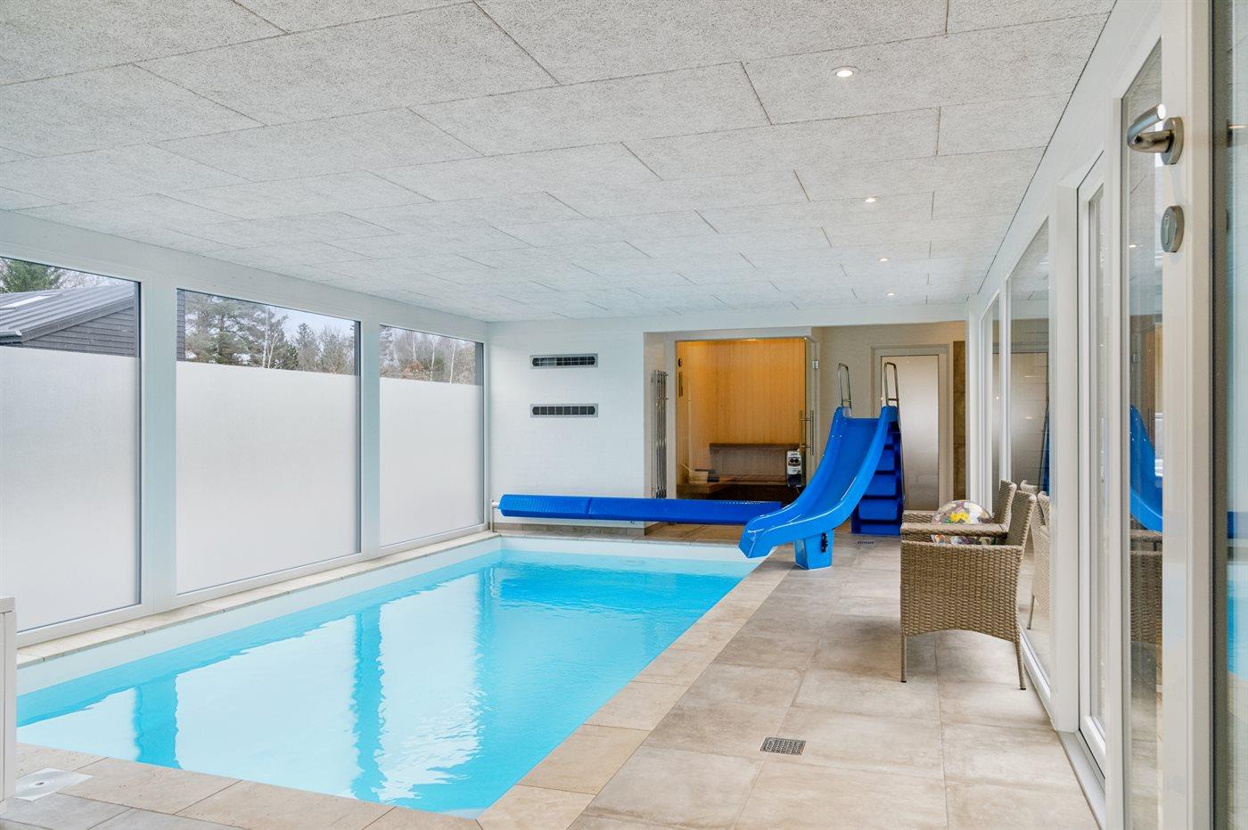 I den indendørs swimmingpool er der mulighed for leg og hyggeligt samvær. Swimmingpoolen måler op til 3 m i bredden, 6 m i længden og den er op til 1,4 m dyb. Vandet er mellem 24 og 28° C varmt. Swimmingpoolen har modstrømsanlæg. Der findes en vandrutsjebane. Der er gulvvarme i swimmingpoolområdet.