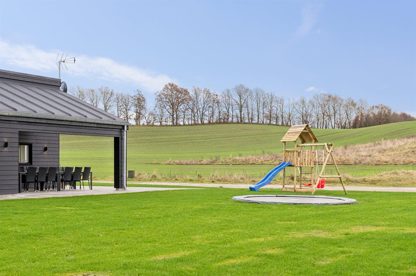 Ferieboligen er beliggende på en 2023 m² stor naturgrund. Der er 800 m til havet. Nærmeste forretning er beliggende i en afstand af 1000 m. Til ferieboligen hører lukket terrasse. Gynge. Sandkasse. Trampolin. Legetårn. Rutchebane. Der er mulighed for at tilberede maden udendørs i udekøkkenet. Grill til rådighed. Der er installeret stik til opladning af elbil. Type 2 stik. Med 11 kW ladeeffekt. Parkering ved ferieboligen.