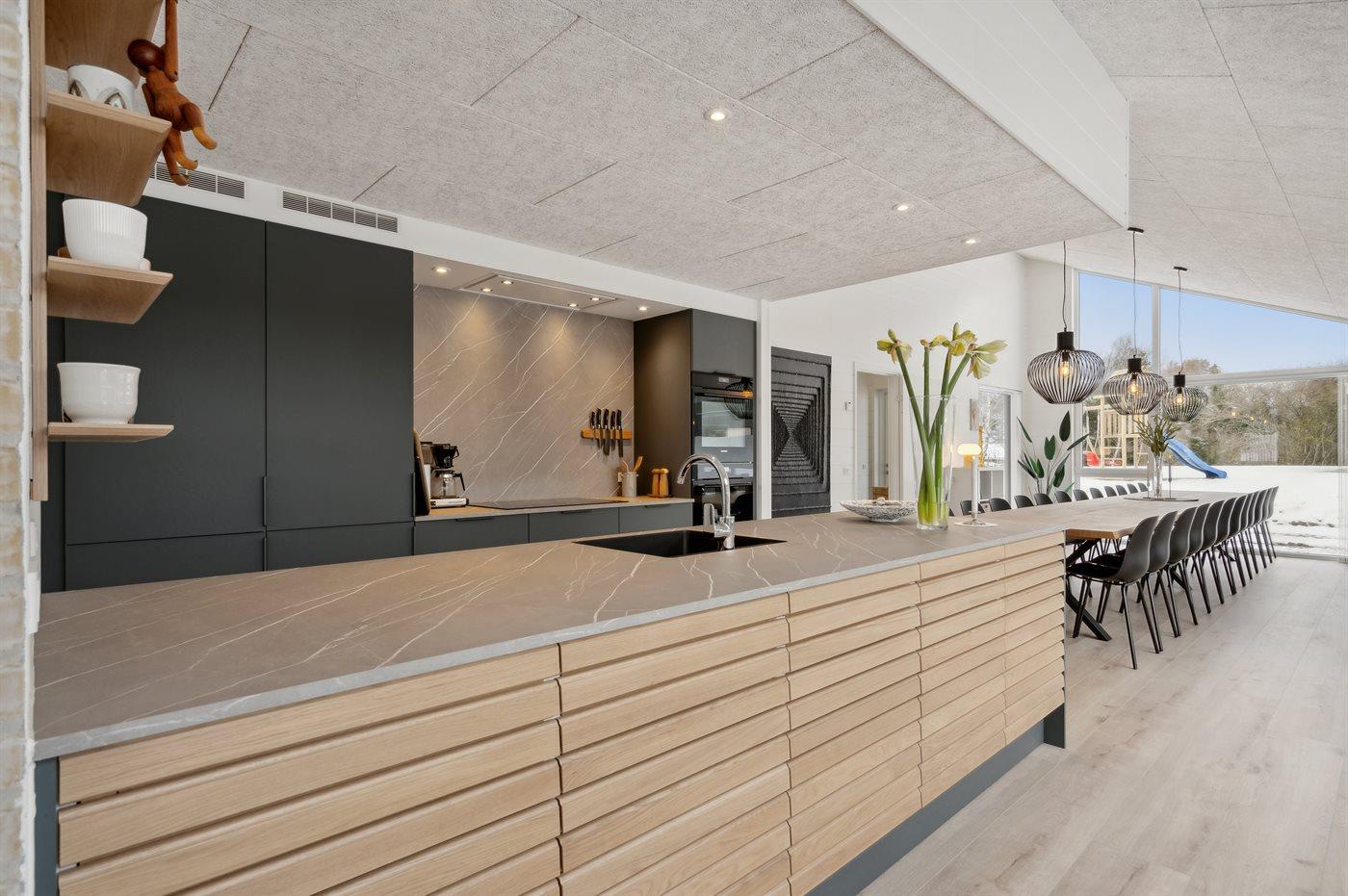 Køkkenet er udstyret med 3 køleskabe. Der er 4 induktionskogeplader, 2 varmluftovne, mikrobølgeovn samt 2 opvaskemaskiner.