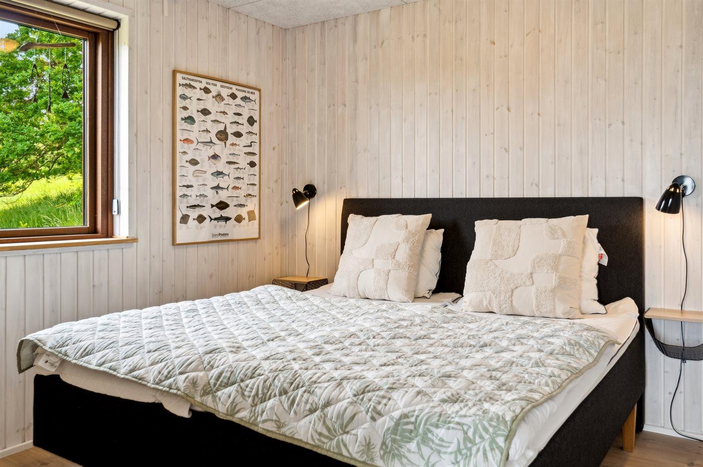 Der er i alt 3 soveværelser. Sovepladserne fordeler sig på: 4 sovepladser i dobbeltsenge. 1 soveplads i enkeltseng.1 soveplads i køjeseng. Derudover er der 1 stk. barneseng.
