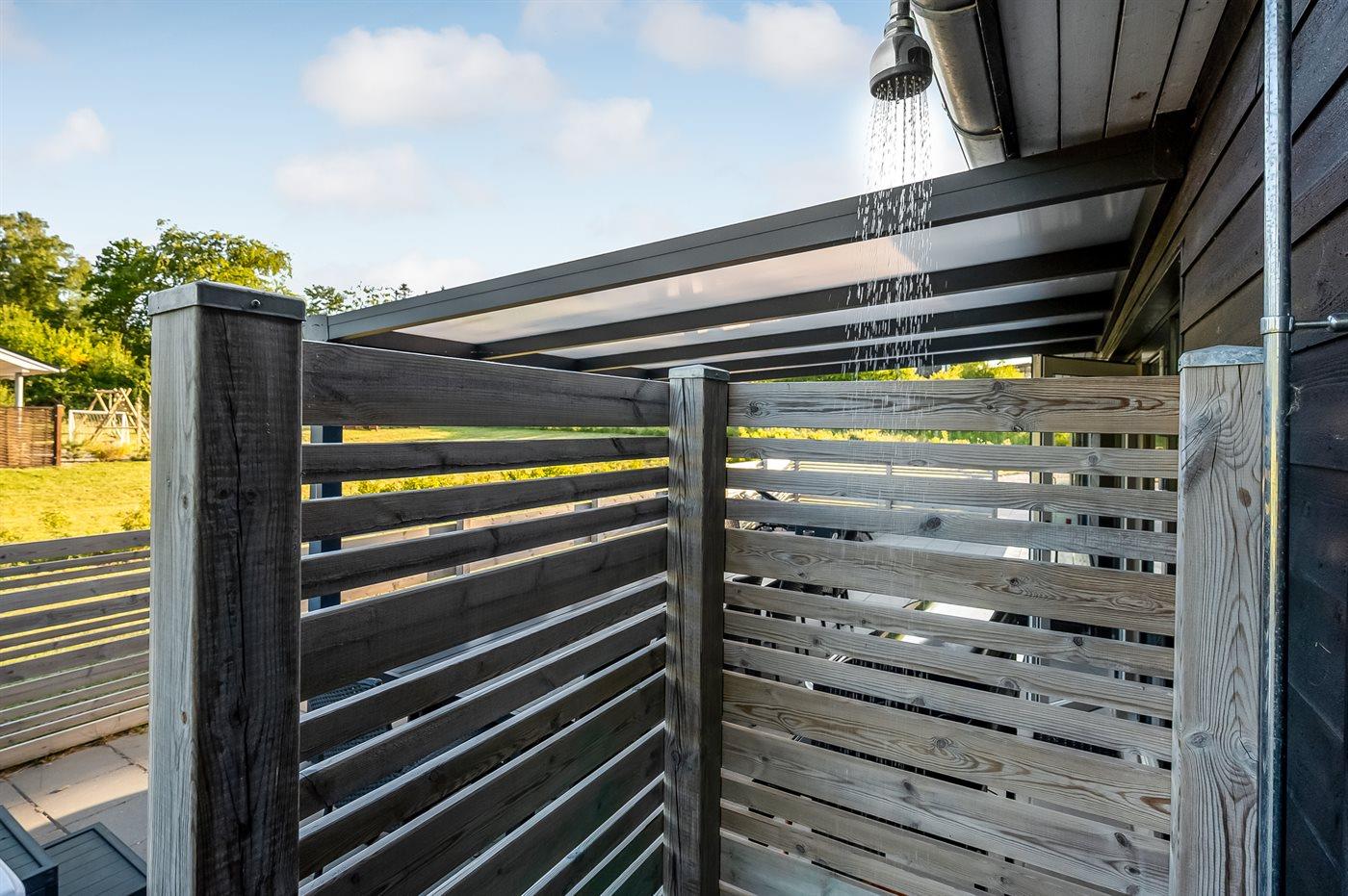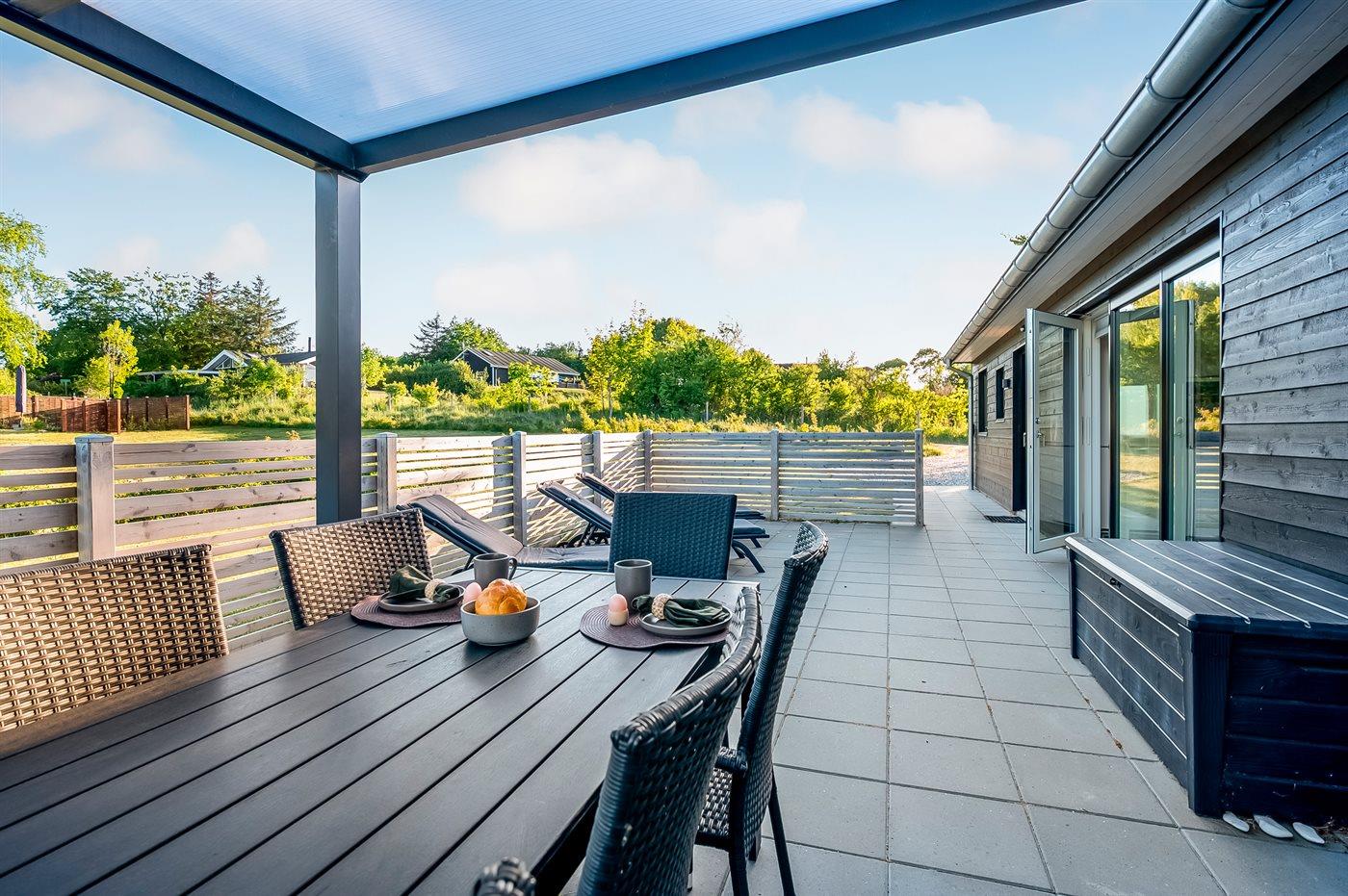 Ferieboligen er beliggende på en 1372 m² stor havegrund. Der er 300 m til havet. Nærmeste forretning er beliggende i en afstand af 1500 m. Til ferieboligen hører åbent terrasseareal. Desuden er der overdækket terrasse. Gynge. Trampolin. Rutchebane. Udendørs bruser. Grill til rådighed. Der er installeret ladeboks til opladning af elbil. CEE stik. Med 11 kW ladeeffekt. Parkering ved ferieboligen.