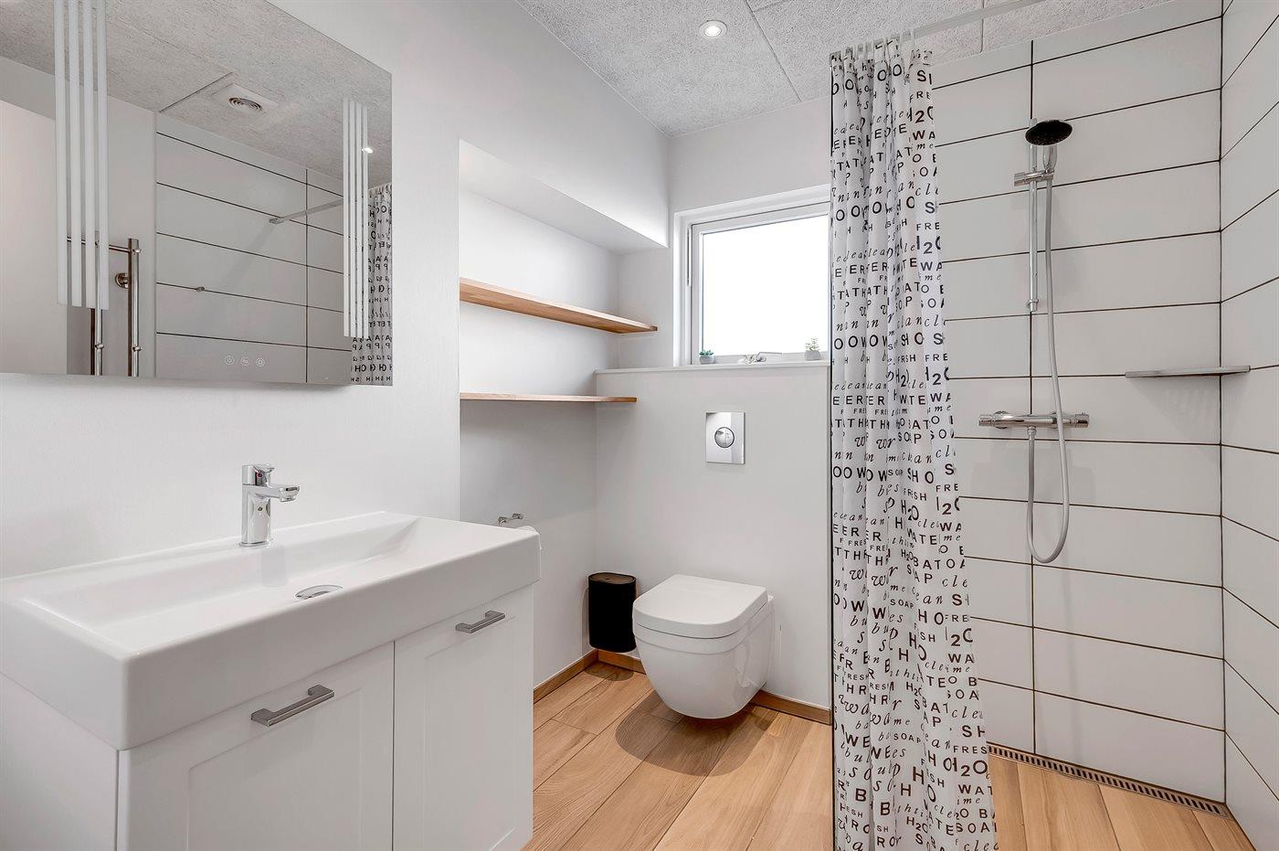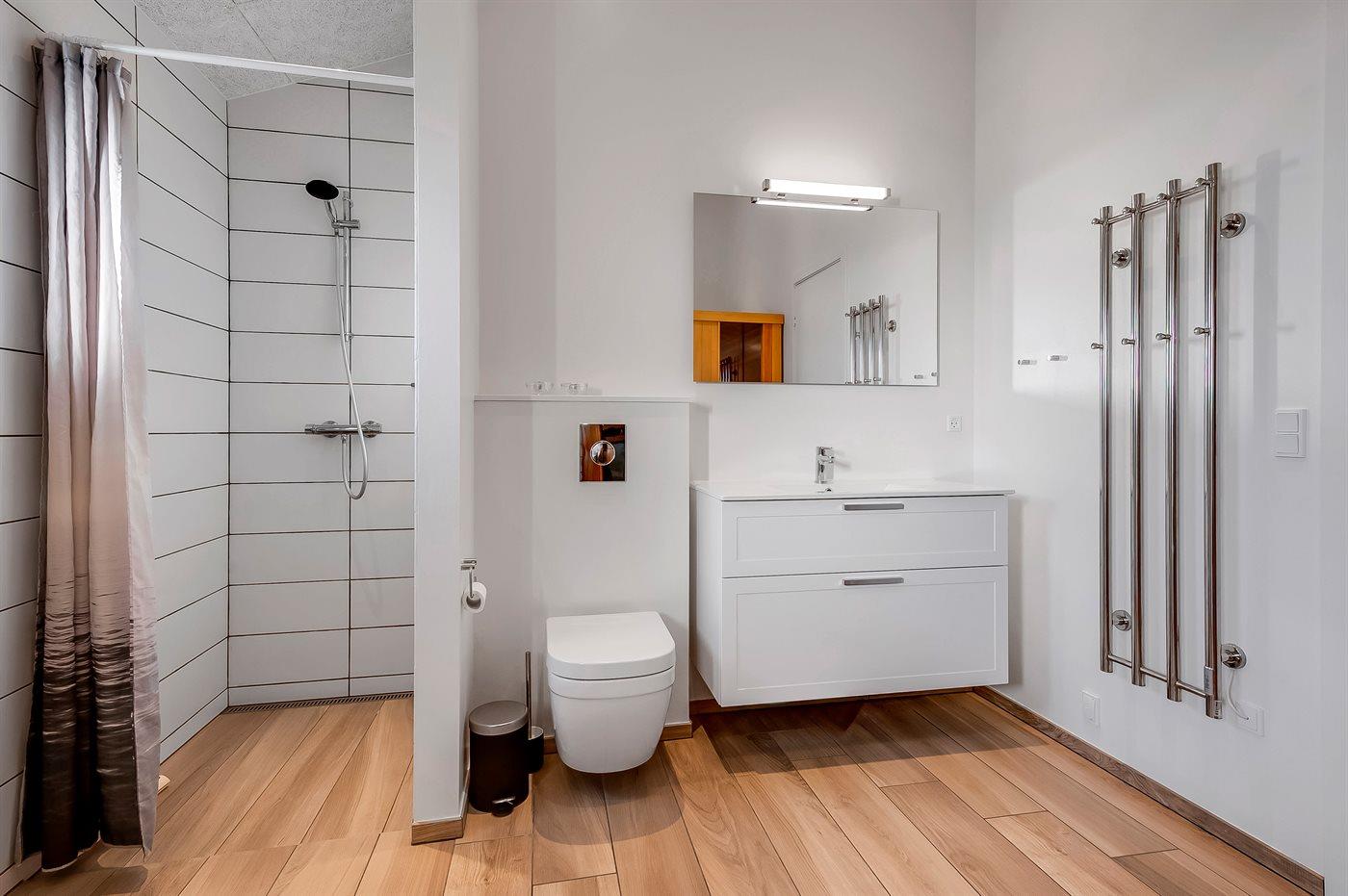 Der er 2 badeværelser med bruseniche og 3 toiletter, heraf 1 gæstetoilet. Der er gulvvarme på 2 badeværelser. Der er gulvvarme på gæstetoilettet. I saunaen er der mulighed for afslapning.