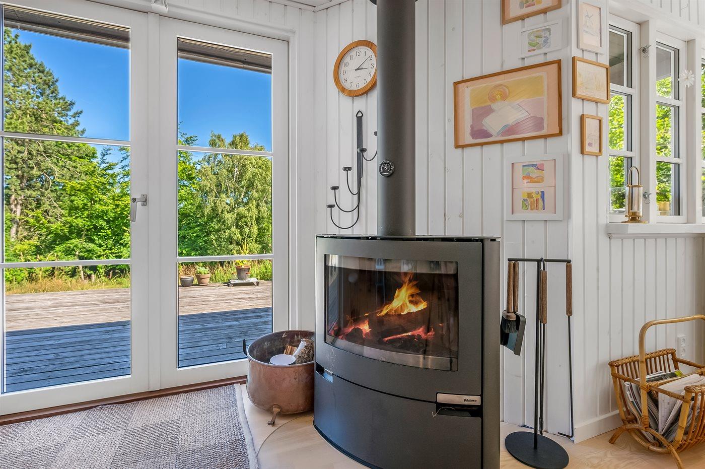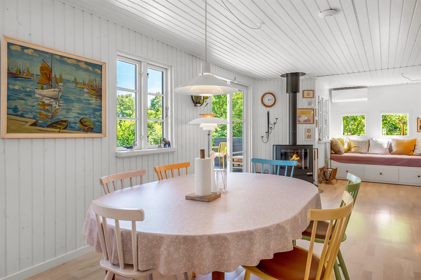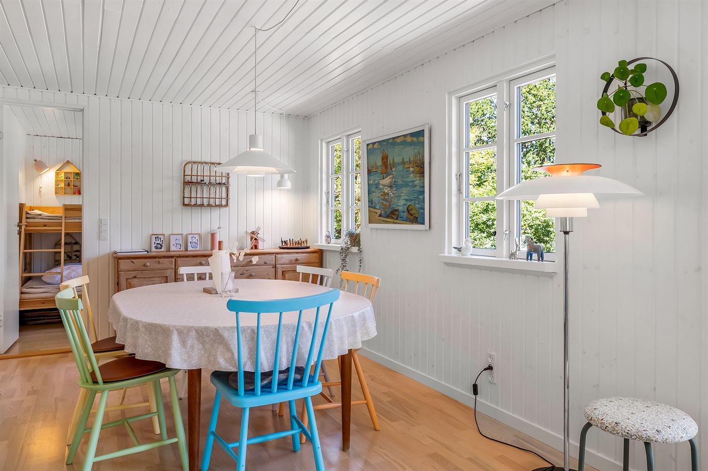 Indvendig fremstår sommerhuset lyst og med en god indretning, som passer rigtig fint til f.eks. en familie med børn eller blot et par, som ønsker at holde ferie i disse skønne omgivelser. Husets midtpunkt er køkken-alrummet, som er kombineret med opholdsstuen, hvor de store vinduespartier giver et virkelig godt lysindfald. Der er fra stuen direkte adgang til den skønne terrasse. Ikke langt fra sommerhuset midt i skoven findes en legeplads, hvor børn kan boltre sig.