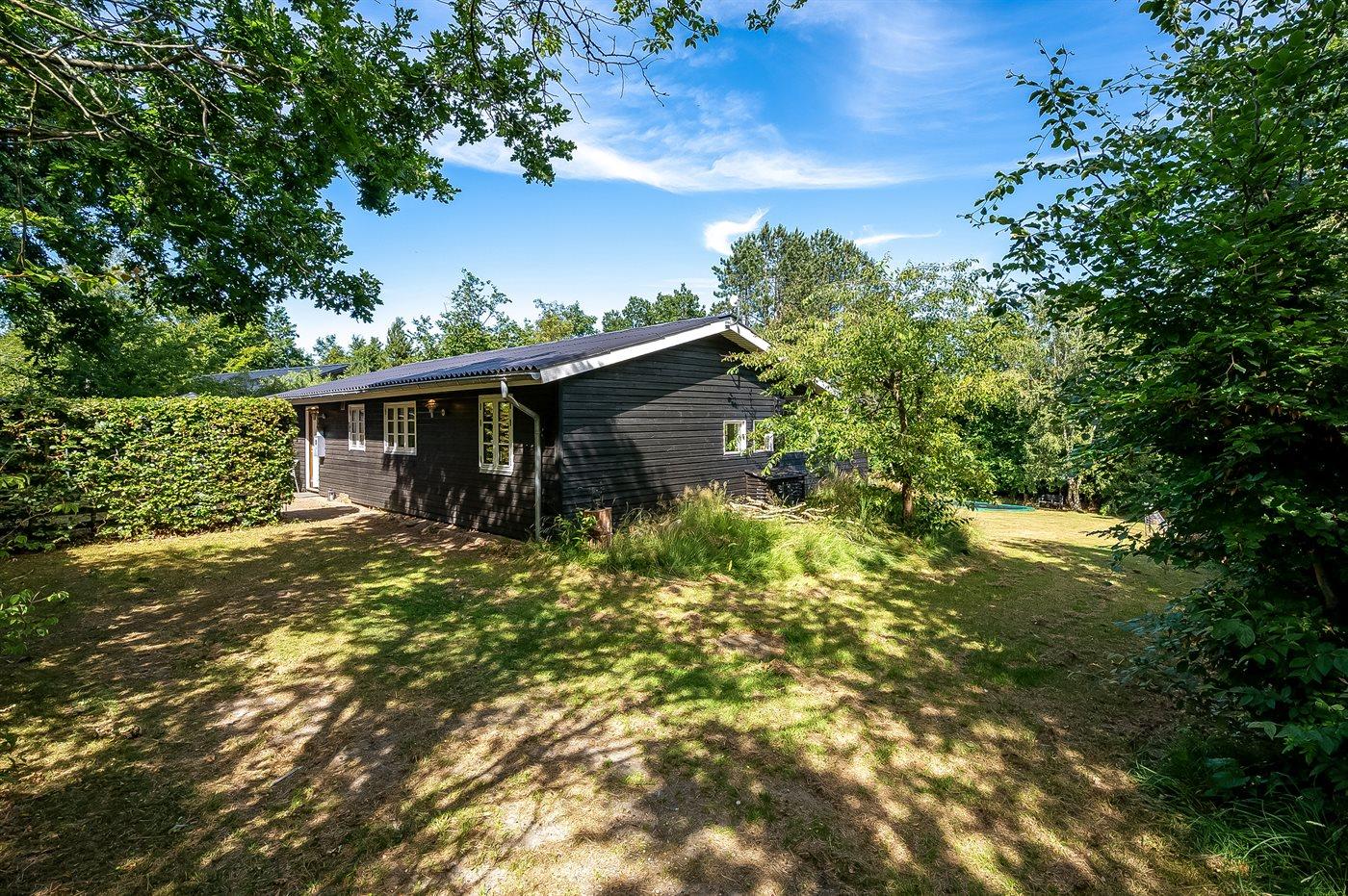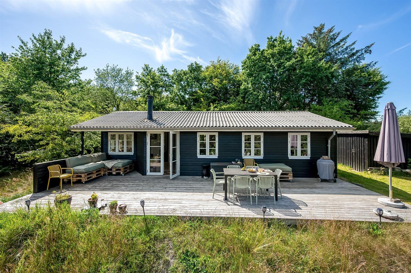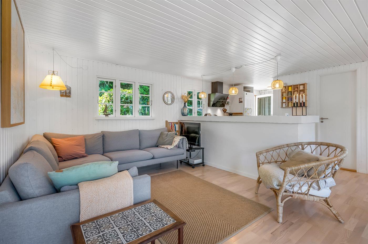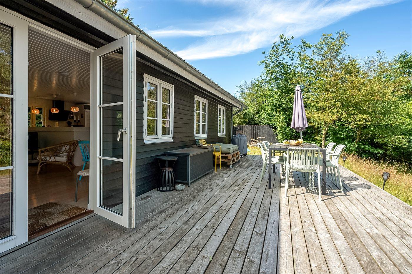 Sommerhuset ligger på en skråning helt ugenert omkranset af store træer og på en stor og skøn grund. Fra den store, delvist overdækkede terrasse er det muligt at have et godt overblik over haven, imens børnene hygger og leger. Derudover er det på grunden muligt at følge solen det meste af dagen og man kan altid finde en krog med læ – her kan stilheden nydes til fulde. Indvendig fremstår sommerhuset lyst og den åbne planløsning sikrer ekstra samvær og nærvær, ligesom lyse farver, små detaljer og hyggekroge sørger for en afslappende