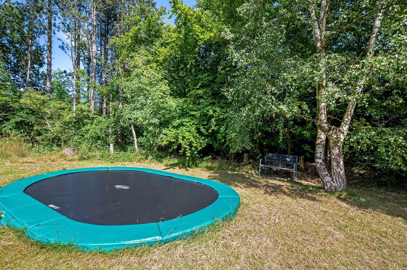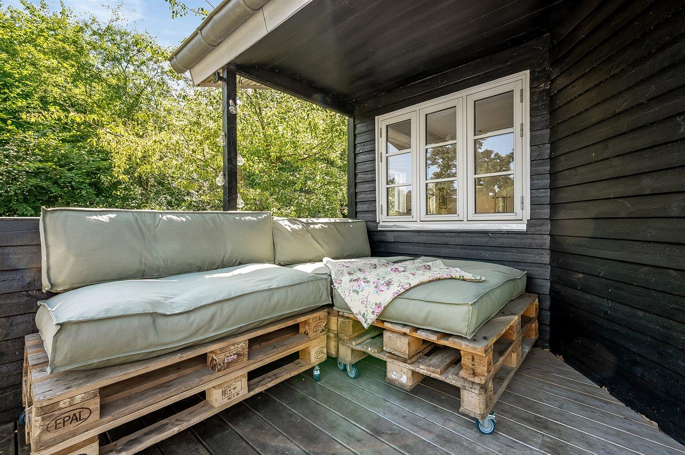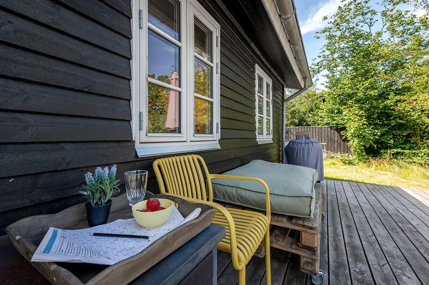 Sommerhuset ligger på en skråning helt ugenert omkranset af store træer og på en stor og skøn grund. Fra den store, delvist overdækkede terrasse er det muligt at have et godt overblik over haven, imens børnene hygger og leger. Derudover er det på grunden muligt at følge solen det meste af dagen og man kan altid finde en krog med læ – her kan stilheden nydes til fulde. Indvendig fremstår sommerhuset lyst og den åbne planløsning sikrer ekstra samvær og nærvær, ligesom lyse farver, små detaljer og hyggekroge sørger for en afslappende