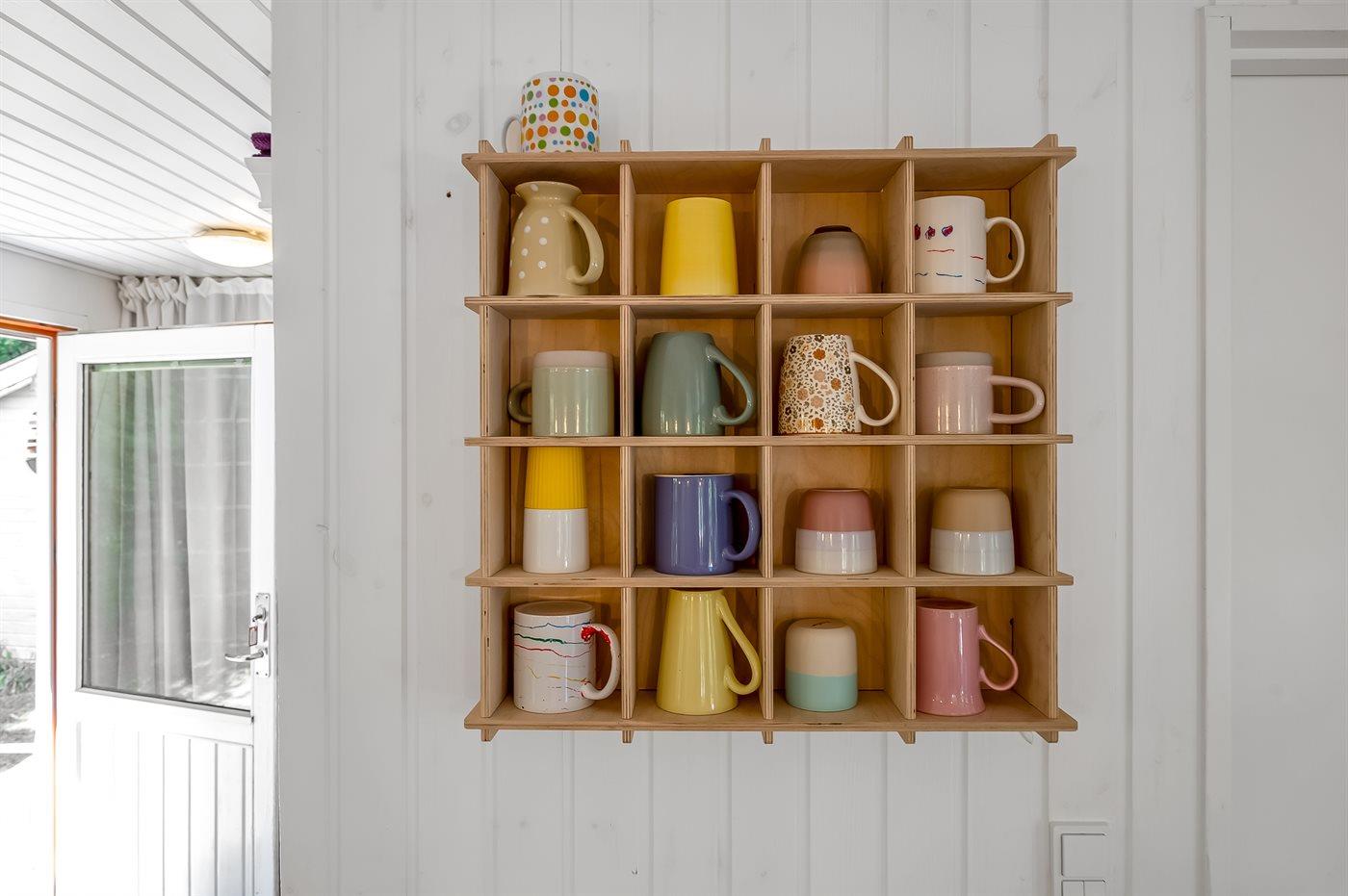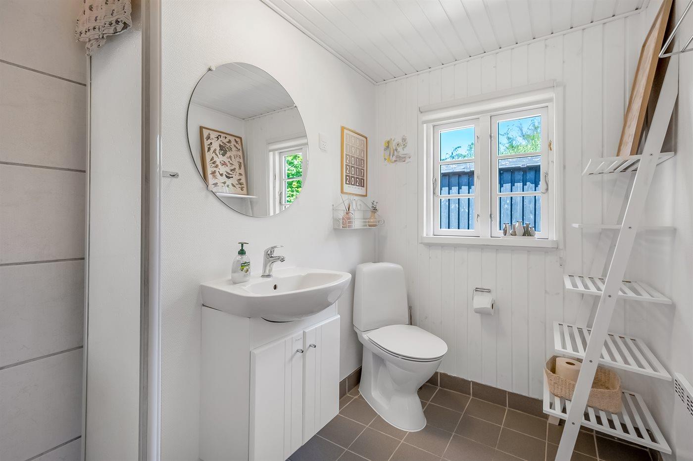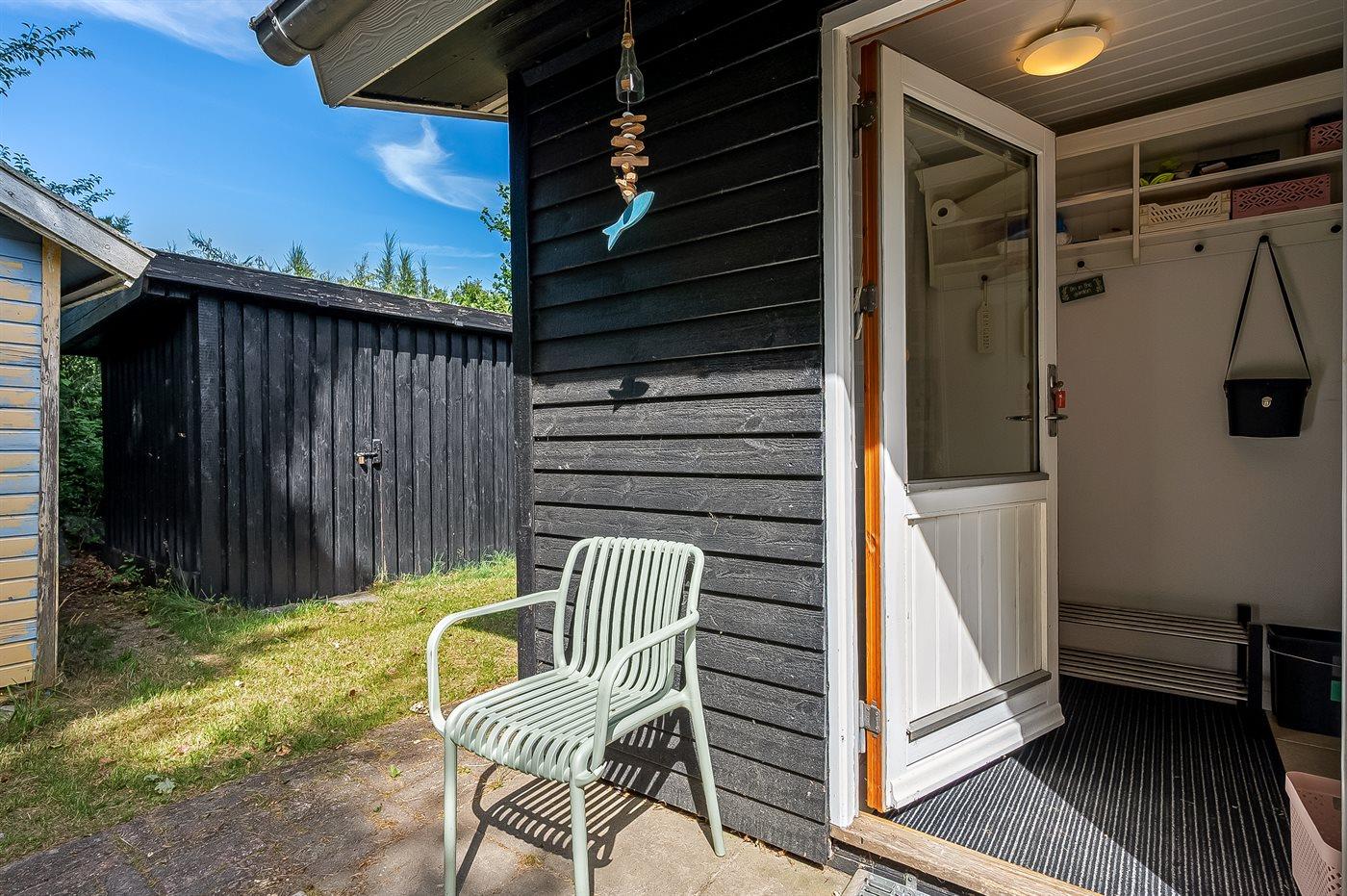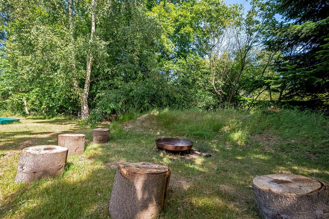 Sommerhuset ligger på en skråning helt ugenert omkranset af store træer og på en stor og skøn grund. Fra den store, delvist overdækkede terrasse er det muligt at have et godt overblik over haven, imens børnene hygger og leger. Derudover er det på grunden muligt at følge solen det meste af dagen og man kan altid finde en krog med læ – her kan stilheden nydes til fulde. Indvendig fremstår sommerhuset lyst og den åbne planløsning sikrer ekstra samvær og nærvær, ligesom lyse farver, små detaljer og hyggekroge sørger for en afslappende