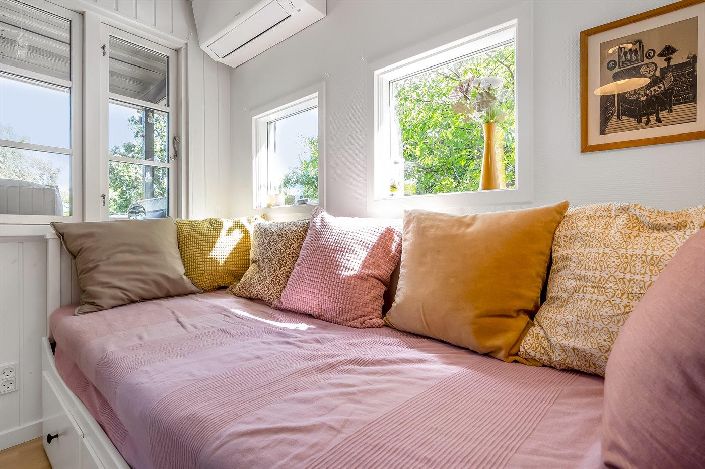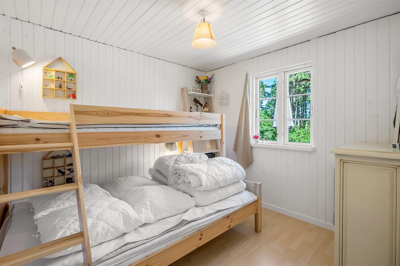 Der er i alt 2 soveværelser. Sovepladserne fordeler sig på: 2 sovepladser i dobbeltseng. 3 sovepladser i køjesenge. 1 soveplads i sovesofa (enkelt). 1 af disse sovepladser befinder sig i stuen. Derudover er der 1 stk. barneseng.