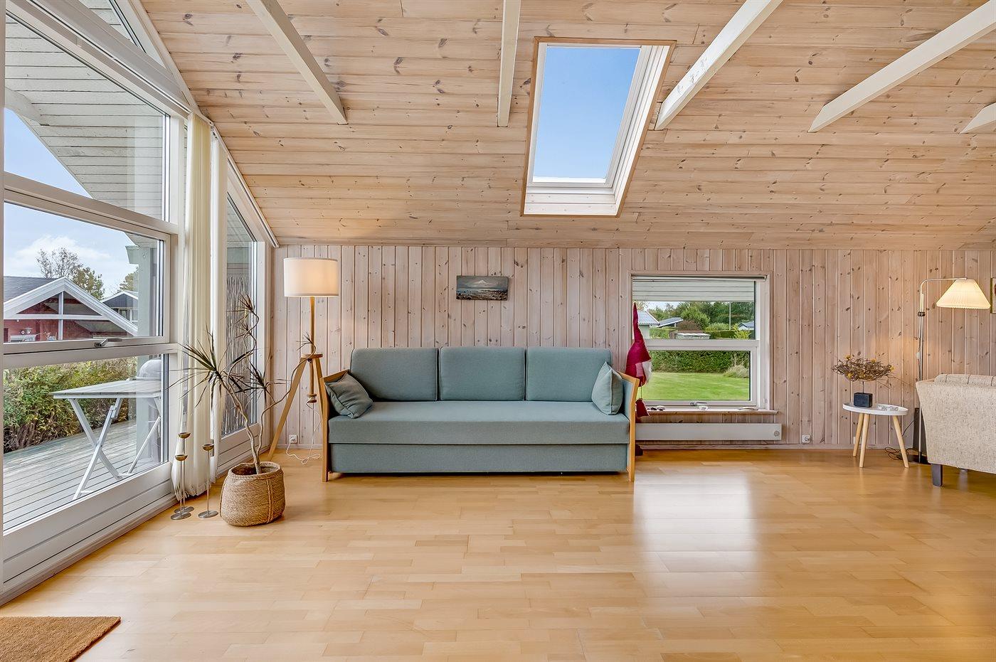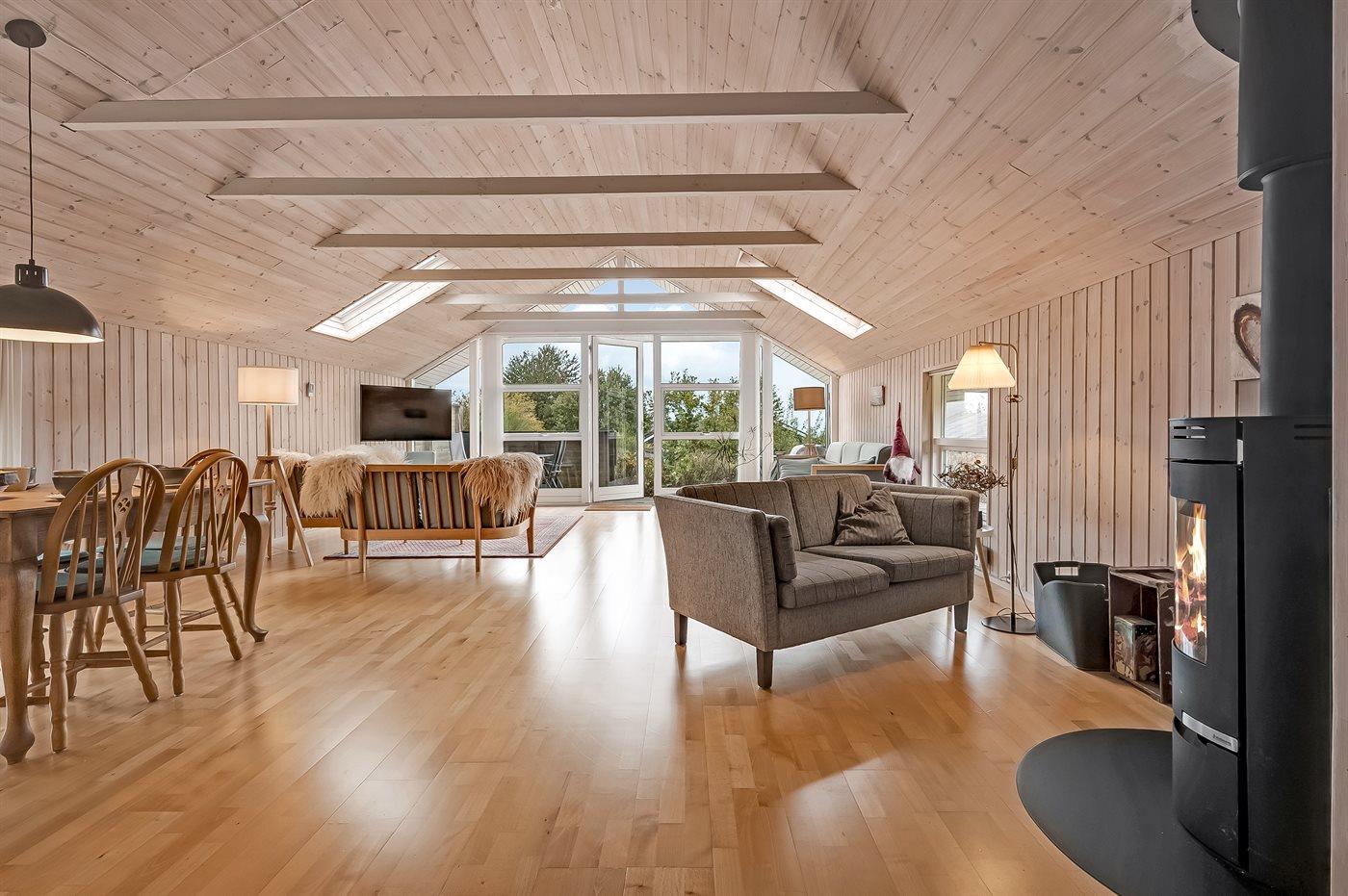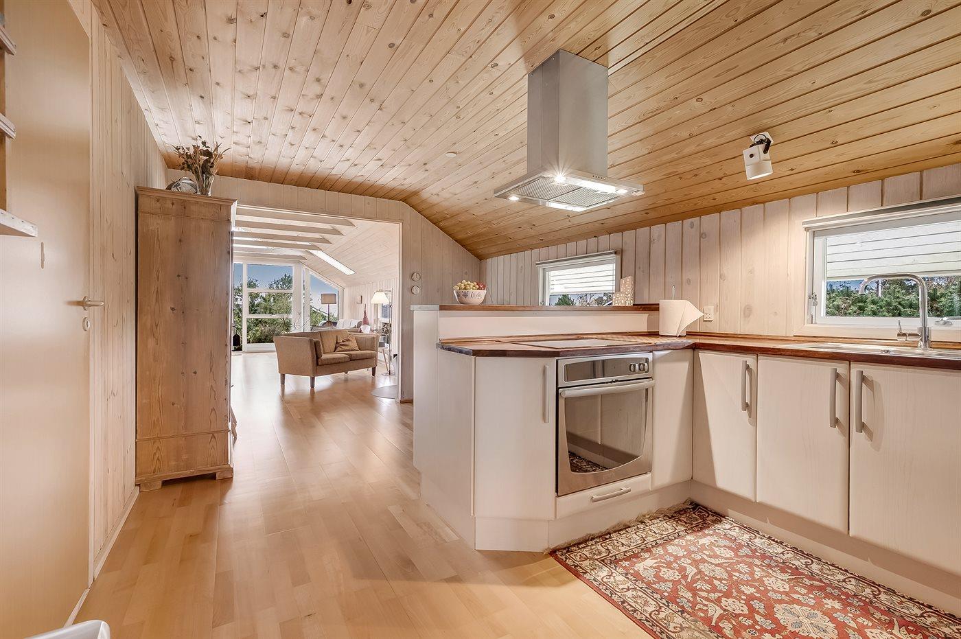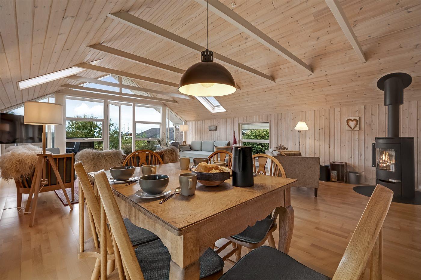 Indenfor fremstår sommerhuset lyst og indbydende med en funktionel indretning, som passer perfekt til en familie med børn – og der er rig mulighed for at tage for eksempel bedsteforældrene med på ferie. Husets hjerte er det dejlige køkken-alrum, der er kombineret med opholdsstuen. De store vinduespartier og ovenlysvinduer sikrer et fantastisk lysindfald, og fra stuen er der direkte adgang til terrassen.