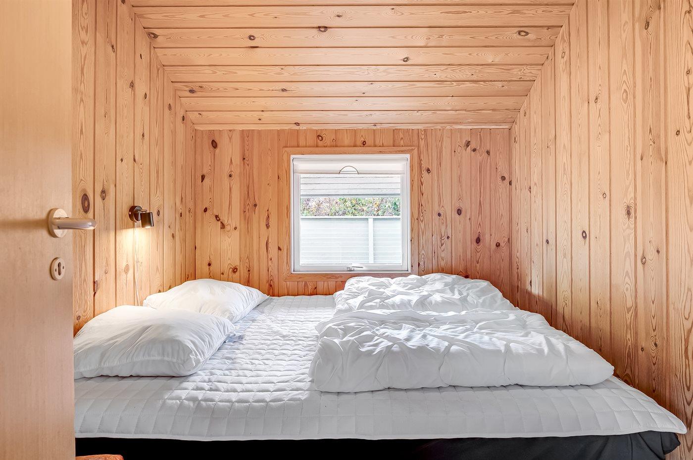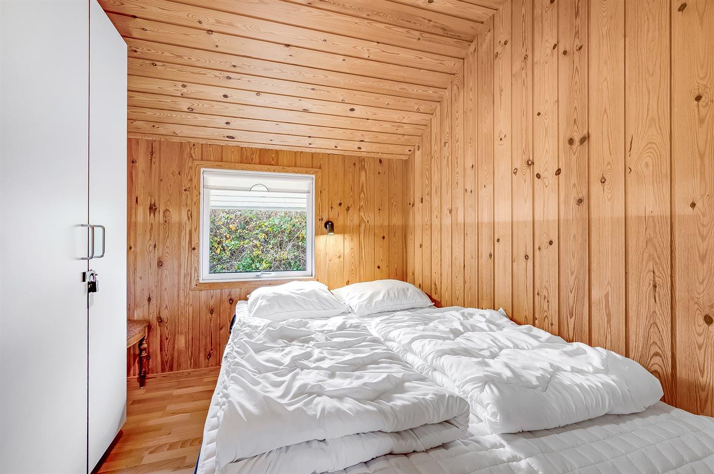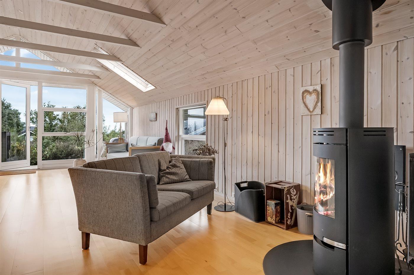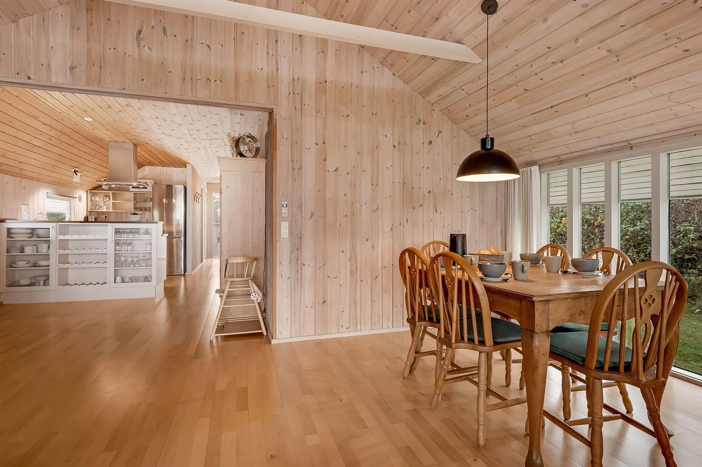 Indenfor fremstår sommerhuset lyst og indbydende med en funktionel indretning, som passer perfekt til en familie med børn – og der er rig mulighed for at tage for eksempel bedsteforældrene med på ferie. Husets hjerte er det dejlige køkken-alrum, der er kombineret med opholdsstuen. De store vinduespartier og ovenlysvinduer sikrer et fantastisk lysindfald, og fra stuen er der direkte adgang til terrassen.