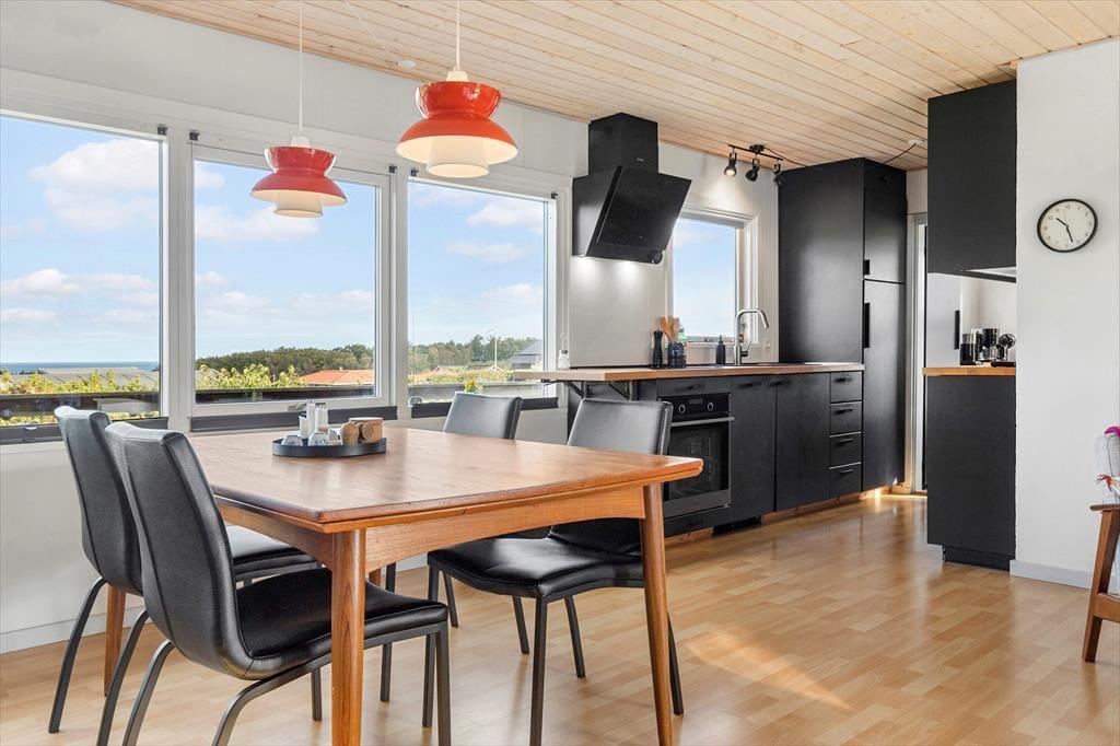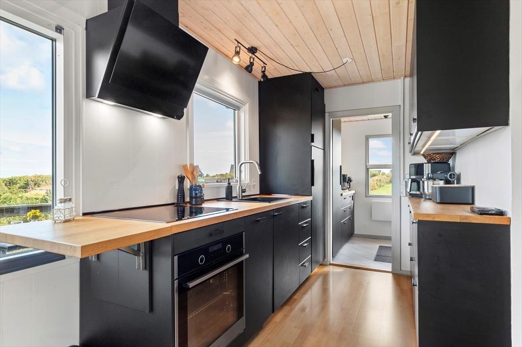 Stuen og alrummet smelter sammen med køkkenet, så I hele tiden er tæt på hinanden – og fra alle tre rum kan I følge med i havets skiftende stemninger. Entréen byder på en hyggelig kaffebar og god plads til at lande, når I kommer hjem fra strandture eller små udflugter.