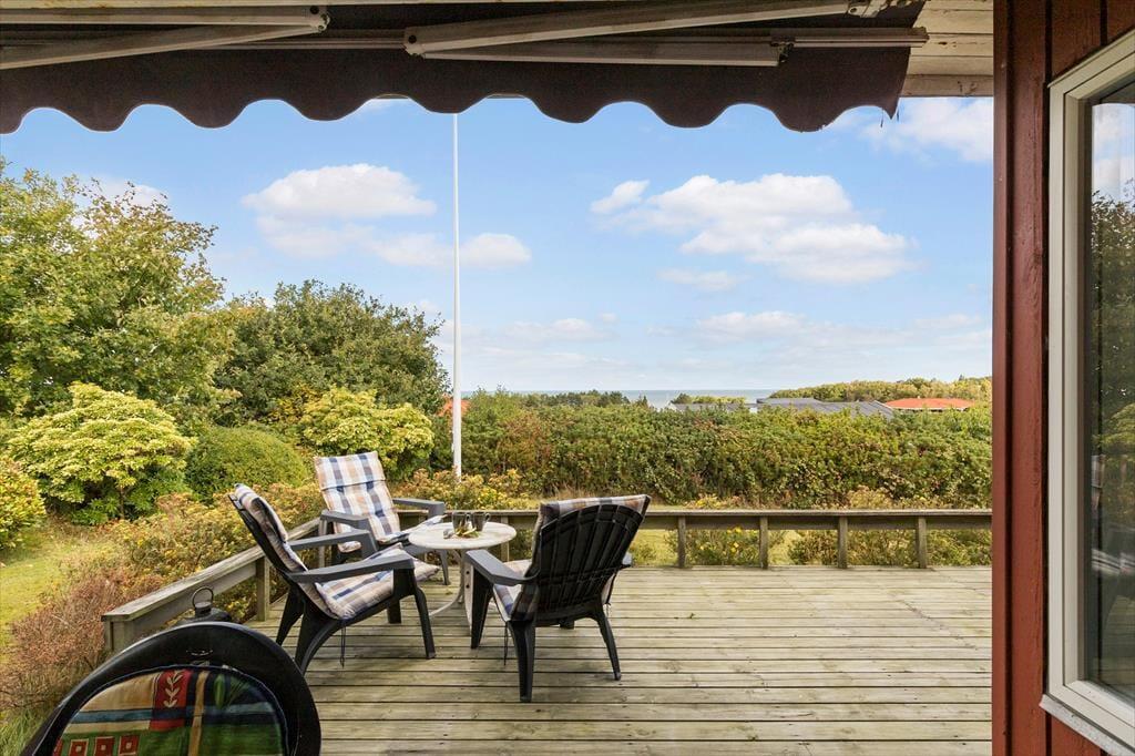 Udenfor venter en skøn grund, der indbyder til både ro og fælles hygge. Den store terrasse åbner sig mod havet og giver jer en fantastisk udsigt, som kan nydes dagen lang. Her finder I et overdækket område med grill og spisebord – perfekt til lange sommeraftener – og overdækningen kan nemt forlænges med en markise, så I altid sidder godt i læ.