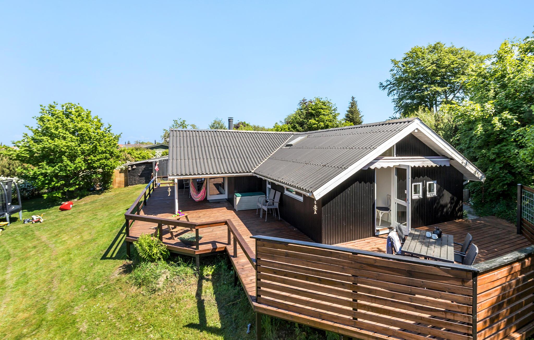 Flot familievenligt træhus tæt på Bønnerup Strand med spabad og stor naturgrund.