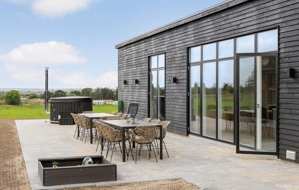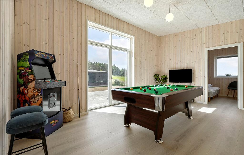 Dette moderne og komfortable sommerhus tilbyder masser af plads til længe ventede familiesammenkomster eller en hyggelig ferie med vennerne. Nyd dagens måltider ved det lange spisebord og snup et spil billard, bordtennis eller arkadespil, mens andre slapper af i saunaen eller spabadet. Det er også altid hyggeligt at finde sammen til gode snakke i de bløde sofaer.