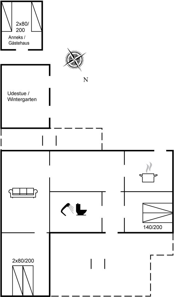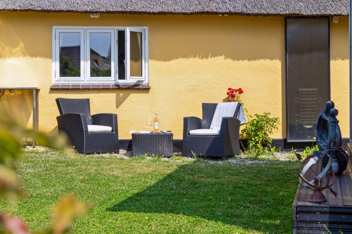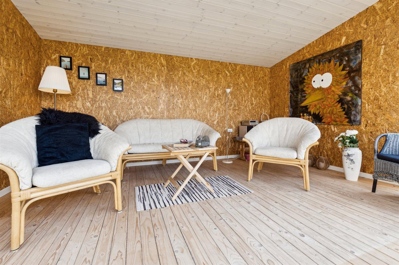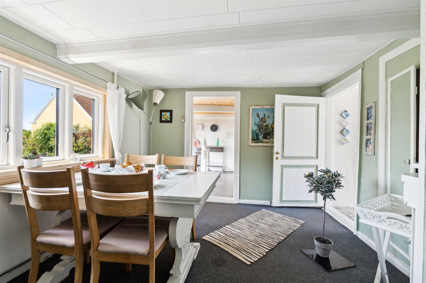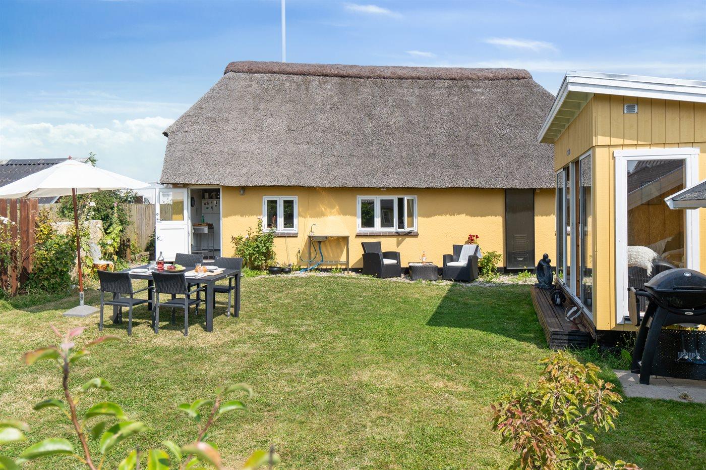 Sommerhuset ligger tilbagetrukket fra vejen og har en dejlig, ugenert sydvendt have bag huset. Her er bl.a. udestue og annekset, hvor de to af sovepladserne befinder sig. Sommerhuset løbende renoveret med respekt for husets sjæl, så der er begrænset ståhøjde nogle steder.