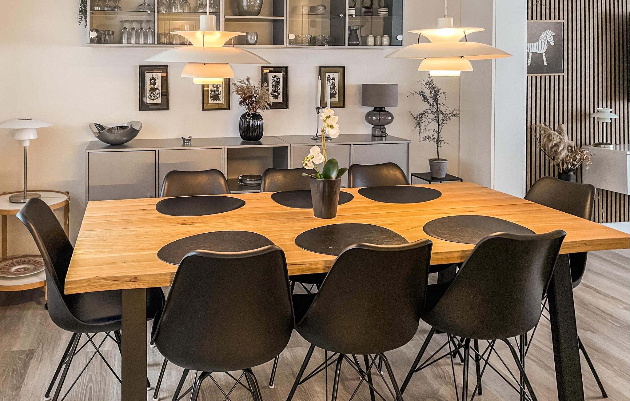 Der er en hyggelig atmosfære i dette moderne og smagfulde feriehus. Fremstil lækre retter i det indbydende køkken-alrum og fyld tiden med hyggelige måltider ved det oplyste spisebord. Efter en lang dag udendørs kan I slappe af med en spilleaften i stuen eller lægge fødderne op i læsestolen, mens I læser en god bog.