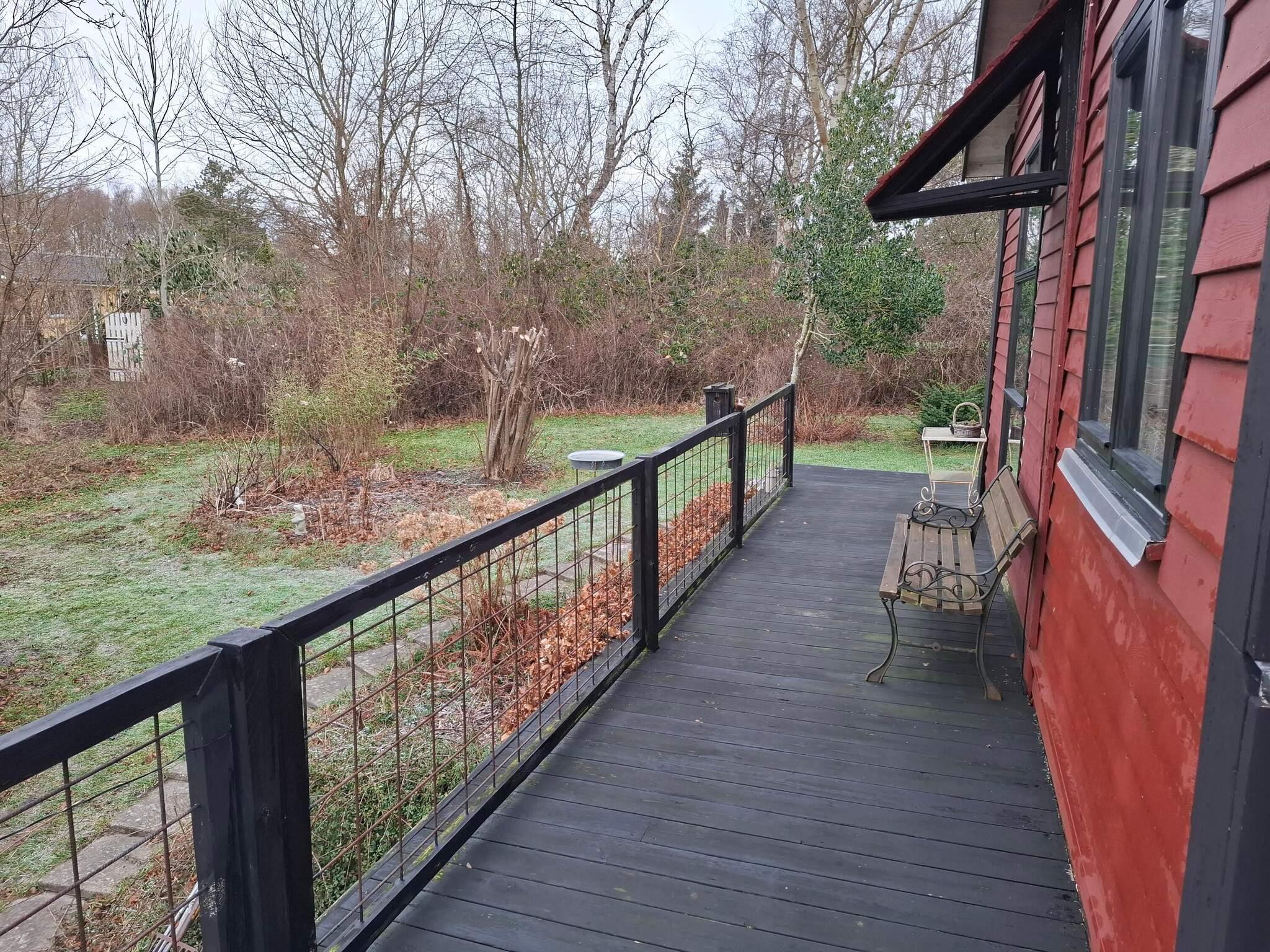 Det veludstyrede køkken er udstyret med elkomfur, køleskab med fryser, mikroovn, kaffemaskine og opvaskemaskine, hvilket gør det nemt at tilberede måltider under dit ophold. Badeværelset har vaskemaskine, toilet, håndvask og bruser for ekstra bekvemmelighed. Udenfor finder du en dejlig terrasse, havemøbler og en kulgrill, perfekt til at nyde måltider og slappe af i den friske luft. Dette sommerhus er ideelt til at skabe varige minder i et fredfyldt og smukt område.