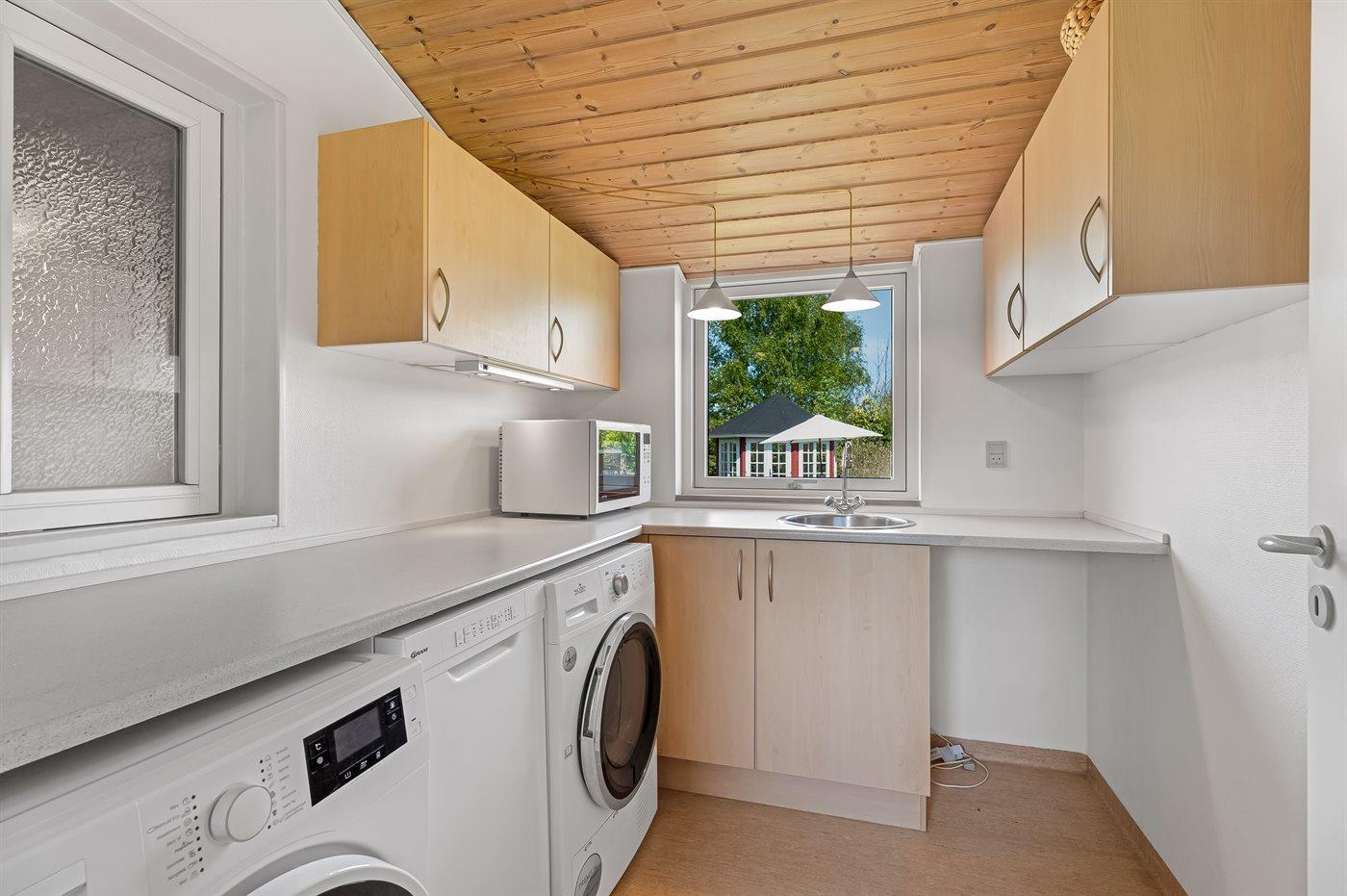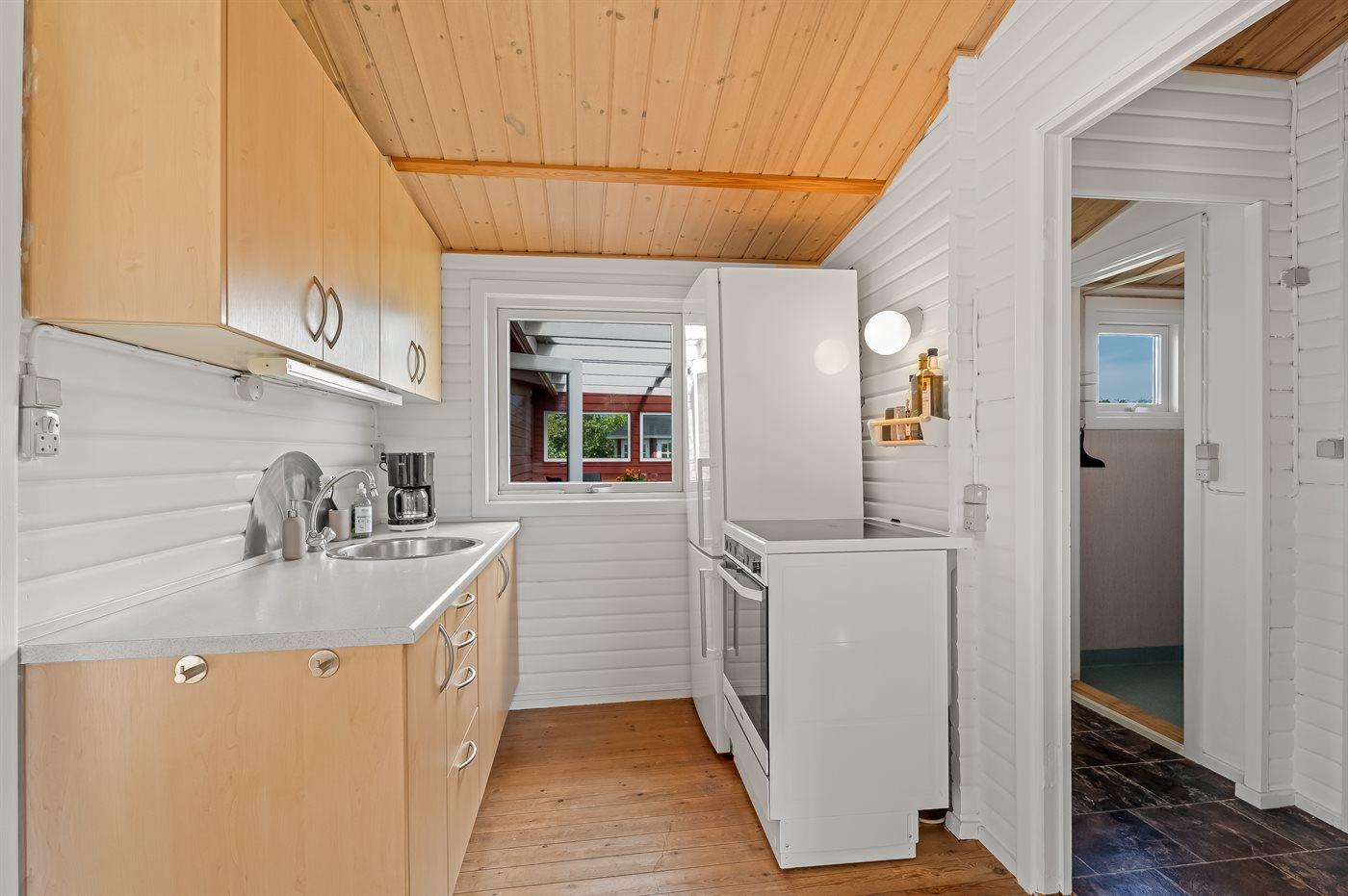 Køkkenet er udstyret med 1 køleskab. Der er 4 keramiske kogeplader, varmluftovn, mikrobølgeovn samt opvaskemaskine.