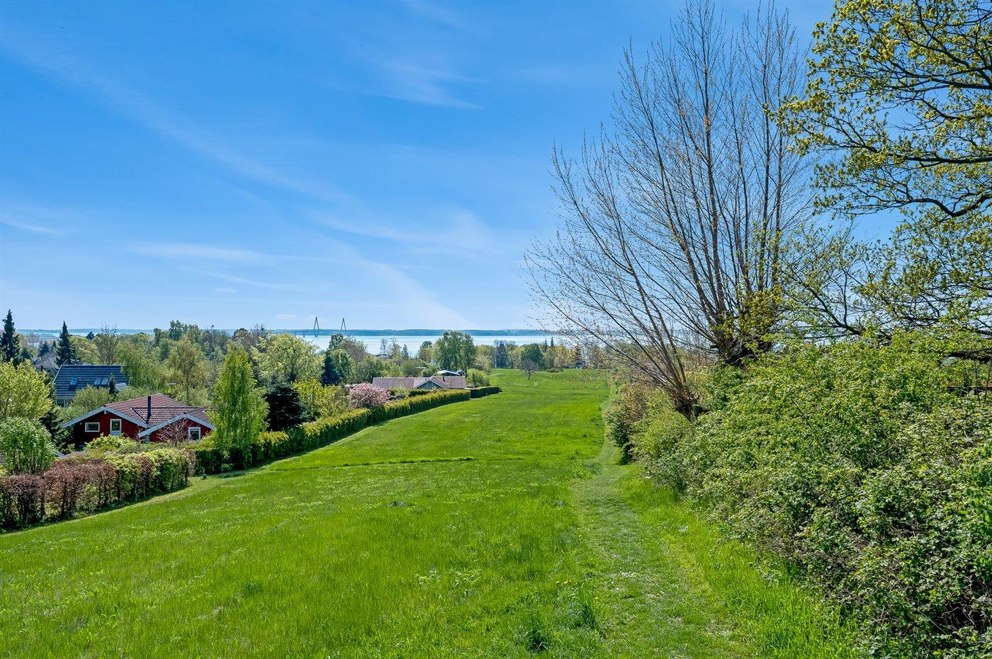 Beliggende for enden af en lille, lukket vej i altid skønne Bakkebølle Strand - lige ud til det store fredede fællesareal/naturområde med stier rundt i området, der strækker sig helt ned i vandkanten. Kun en lille vandring i det bakkede landskab på ca. 700 meter til fødderne bliver våde.