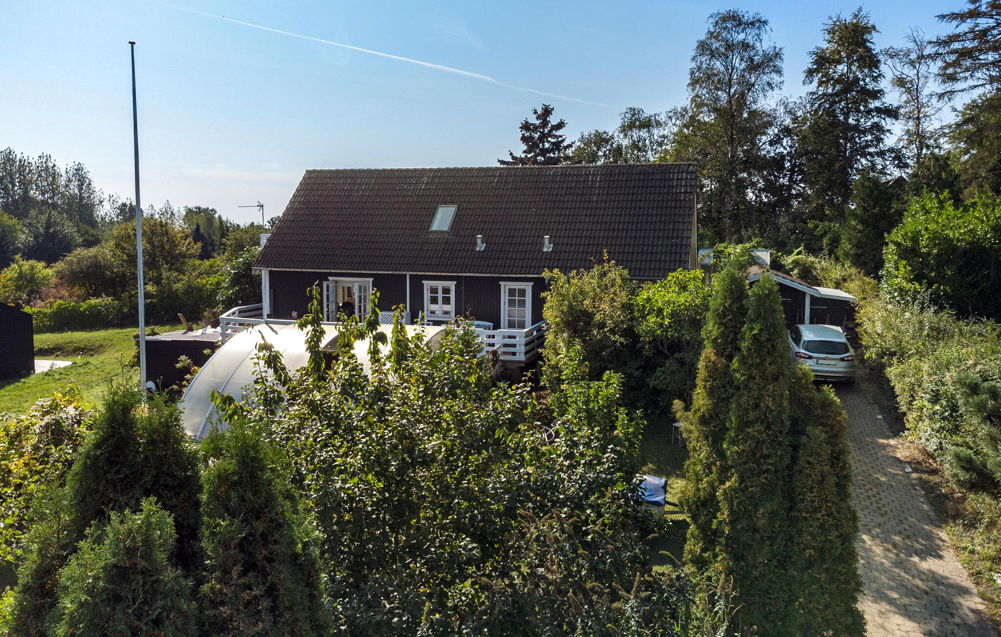 Hyggeligt sommerhus tæt på Bakkebølle Strand med naturgrund, aktivitetsrum og delvis havudsigt.