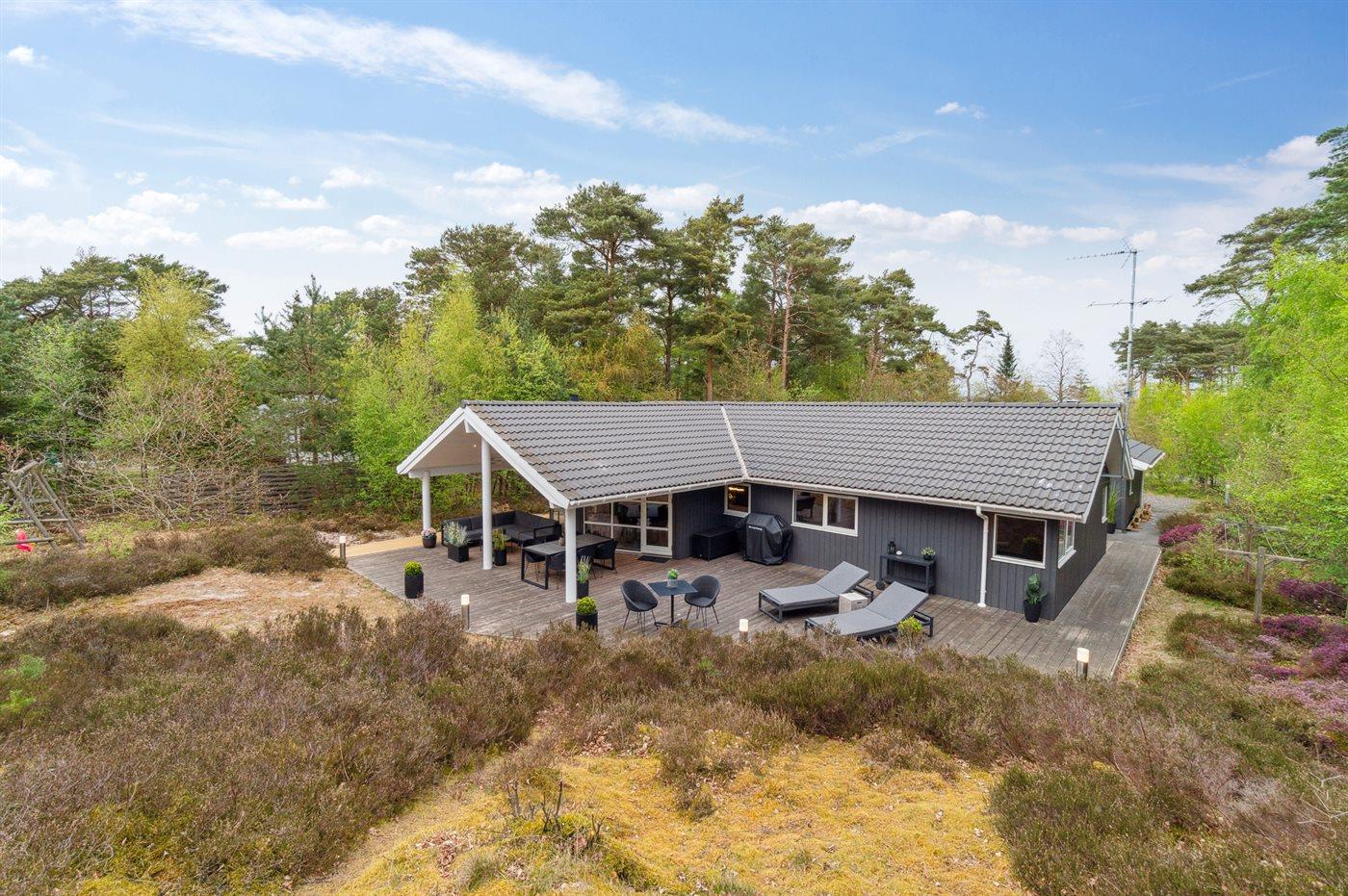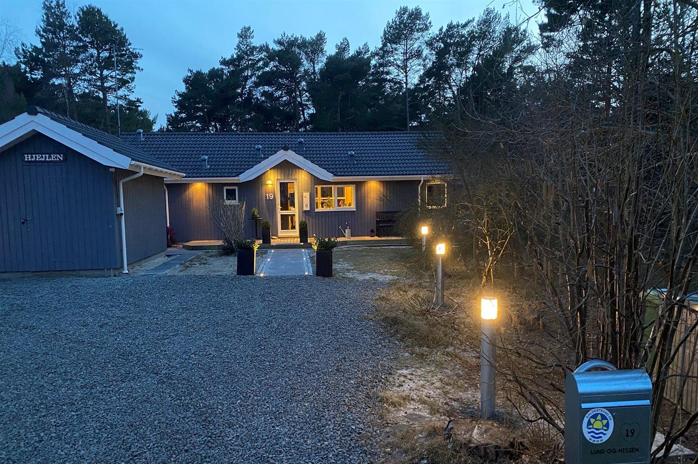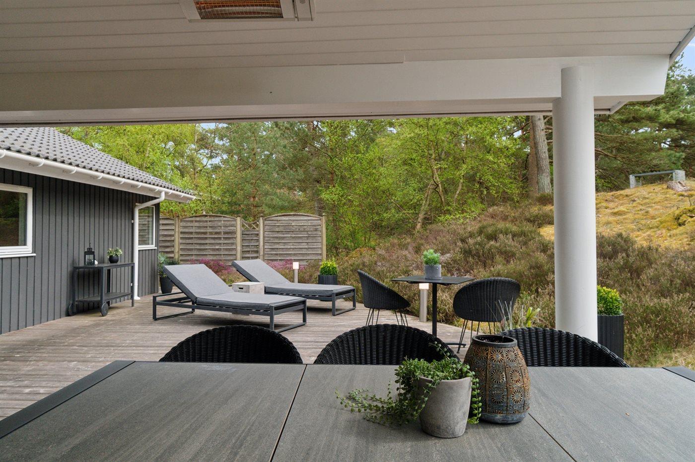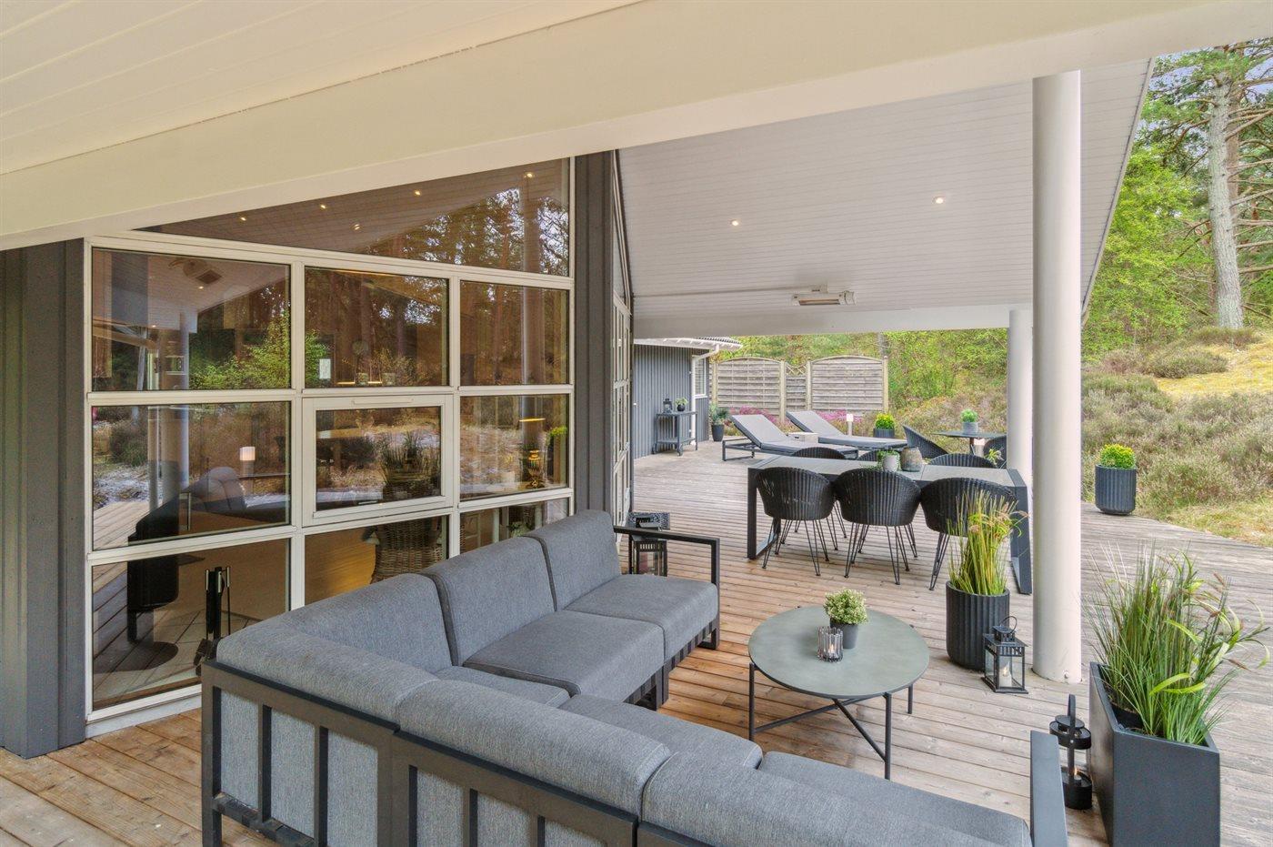 Ferieboligen er beliggende på en 1260 m² stor naturgrund. Der er 75 m til havet. Nærmeste forretning er beliggende i en afstand af 900 m. Til ferieboligen hører 25 m² terrasseareal. Desuden er der 18 m² overdækket terrasse. Der er redskabsrum. Gynge. Afskærmet udendørs bruser. Grill til rådighed. Der er installeret stik til opladning af elbil. Type 2 stik. Parkering ved ferieboligen.