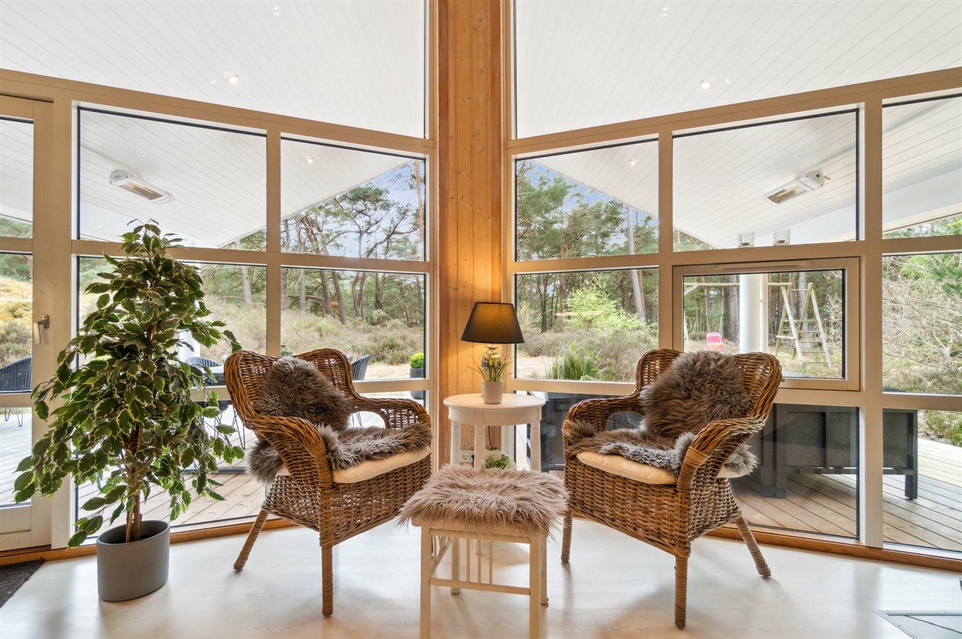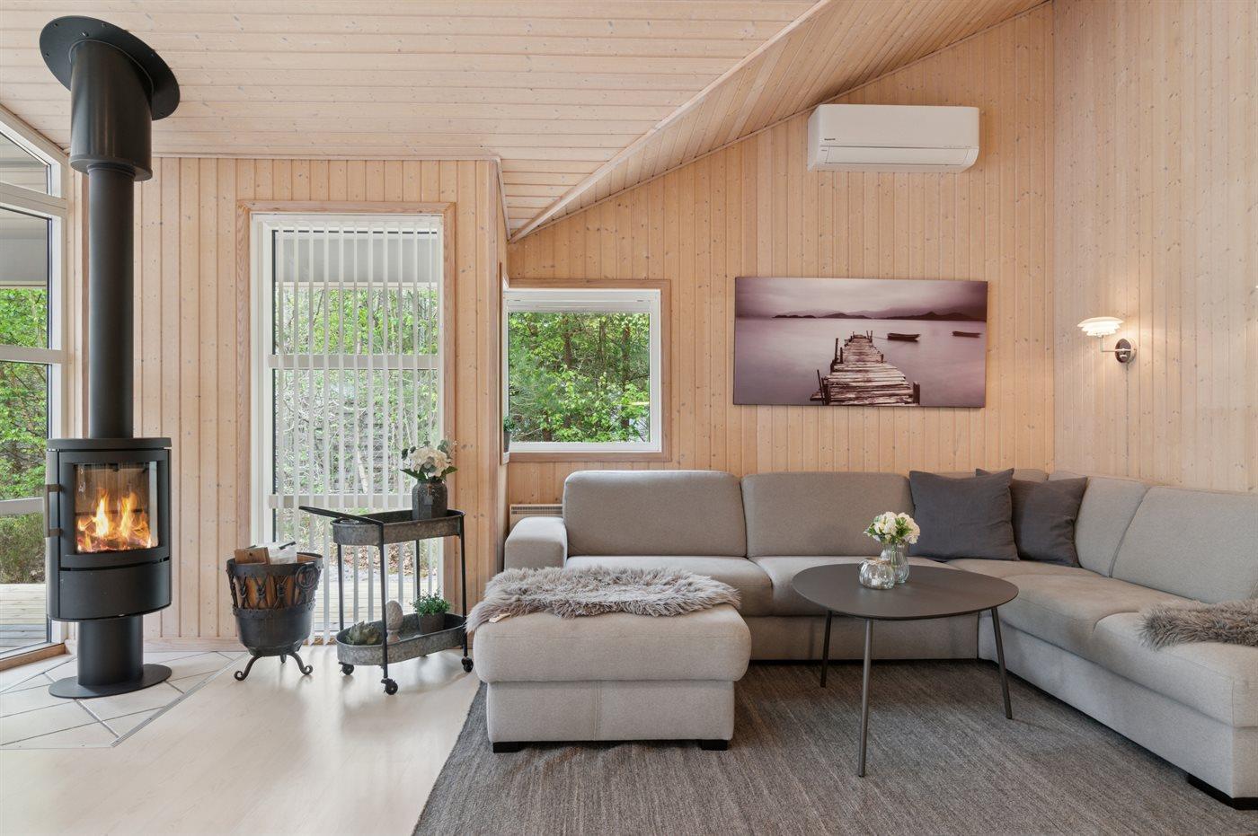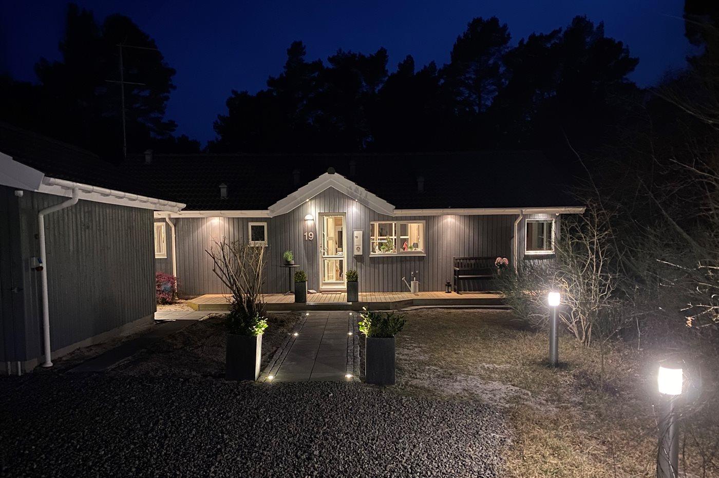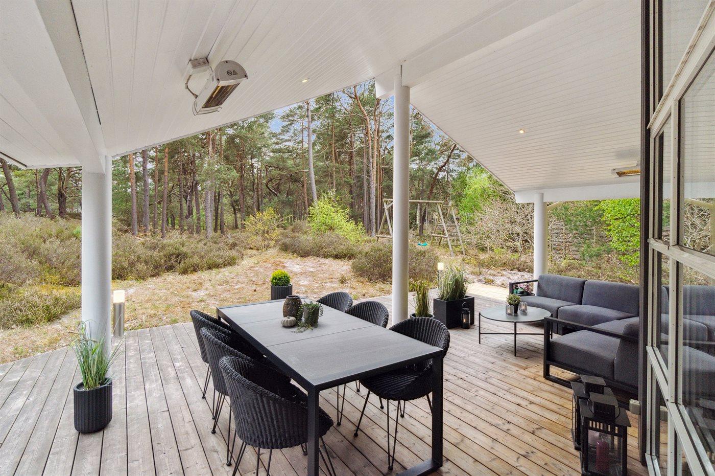 Ferieboligen er beliggende på en 1260 m² stor naturgrund. Der er 75 m til havet. Nærmeste forretning er beliggende i en afstand af 900 m. Til ferieboligen hører 25 m² terrasseareal. Desuden er der 18 m² overdækket terrasse. Der er redskabsrum. Gynge. Afskærmet udendørs bruser. Grill til rådighed. Der er installeret stik til opladning af elbil. Type 2 stik. Parkering ved ferieboligen.