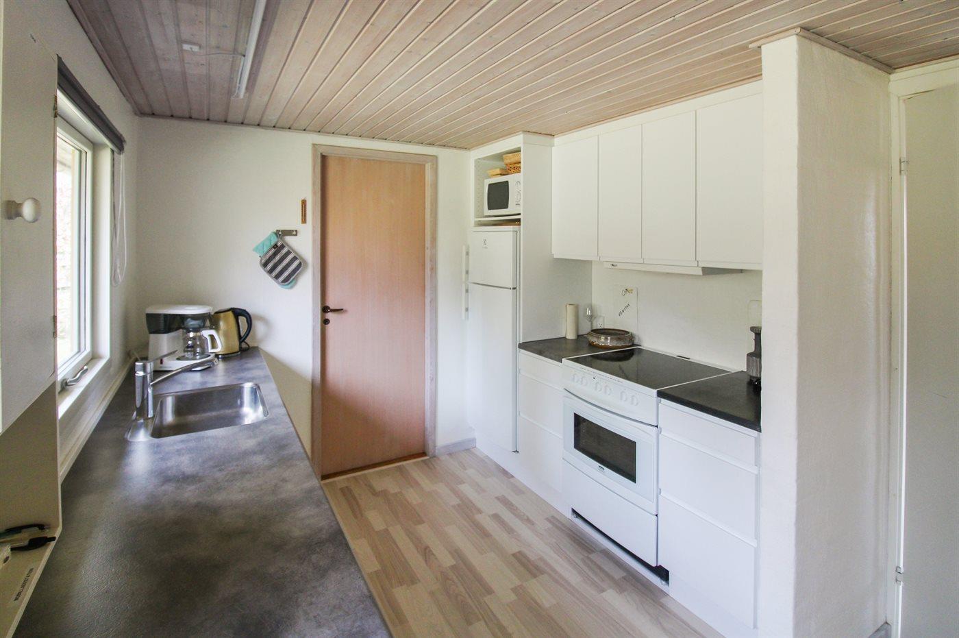 Køkkenet er udstyret med 1 køleskab. Der er 4 keramiske kogeplader, varmluftovn, mikrobølgeovn samt opvaskemaskine.