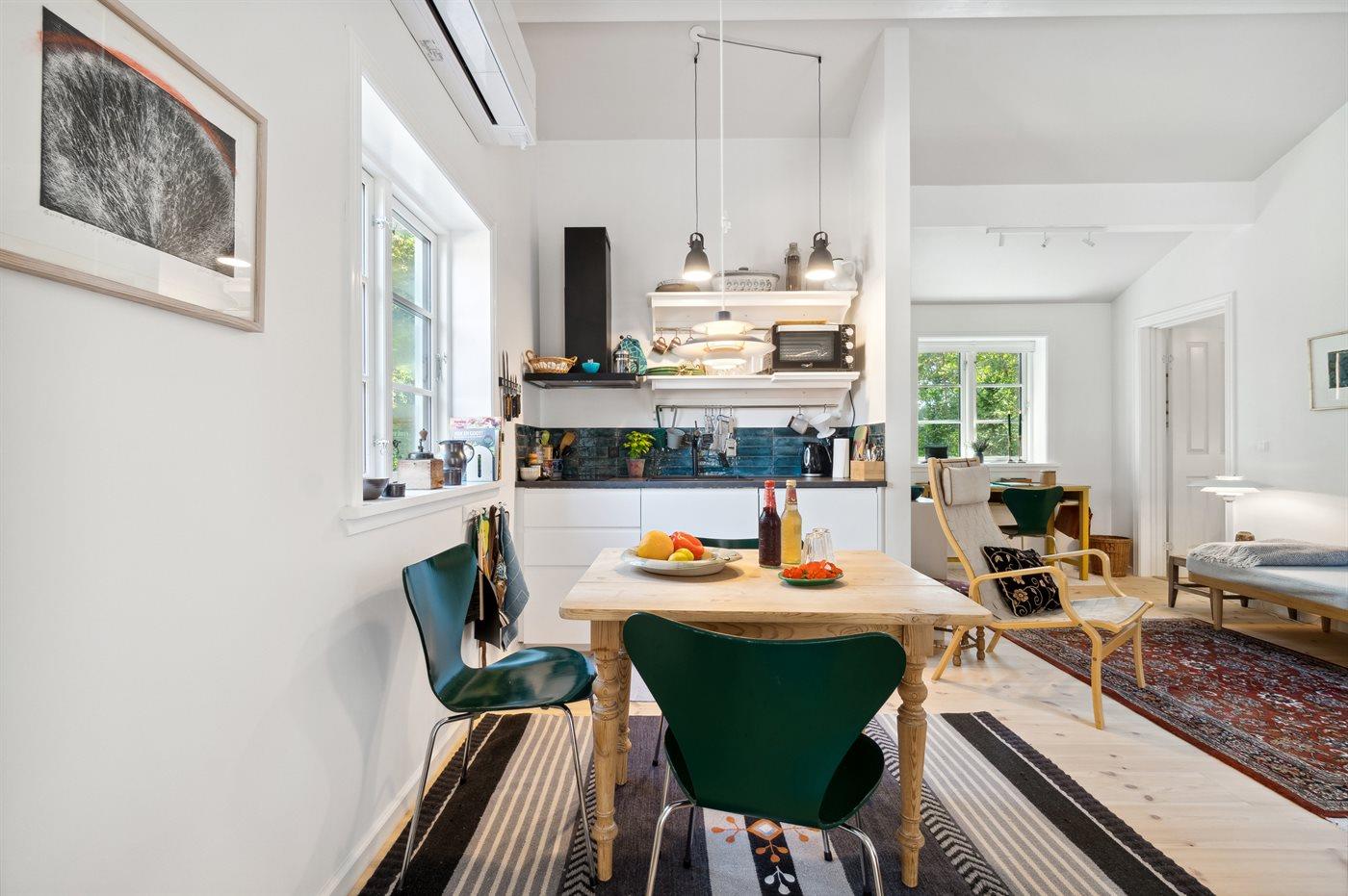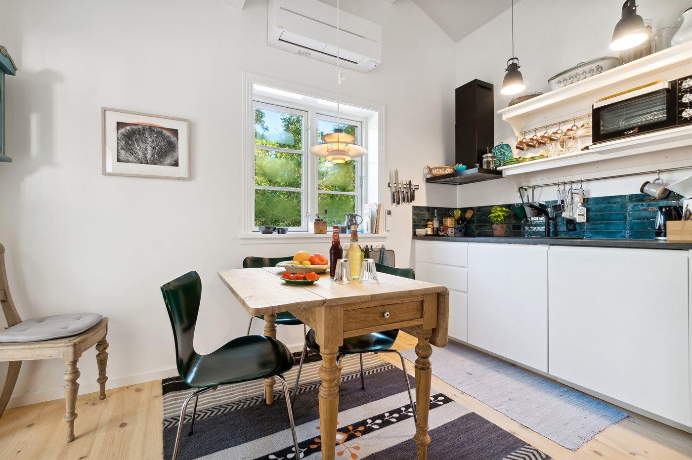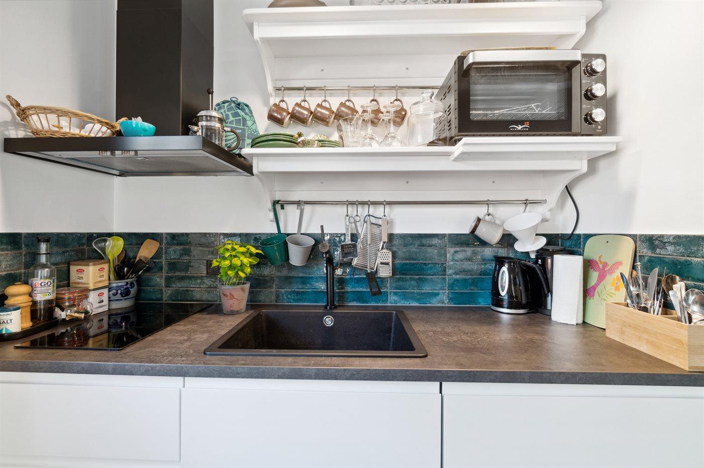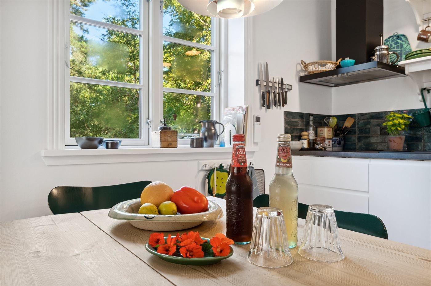 Køkkenet er udstyret med 1 køleskab. Der er 2 induktionskogeplader, varmluftovn.