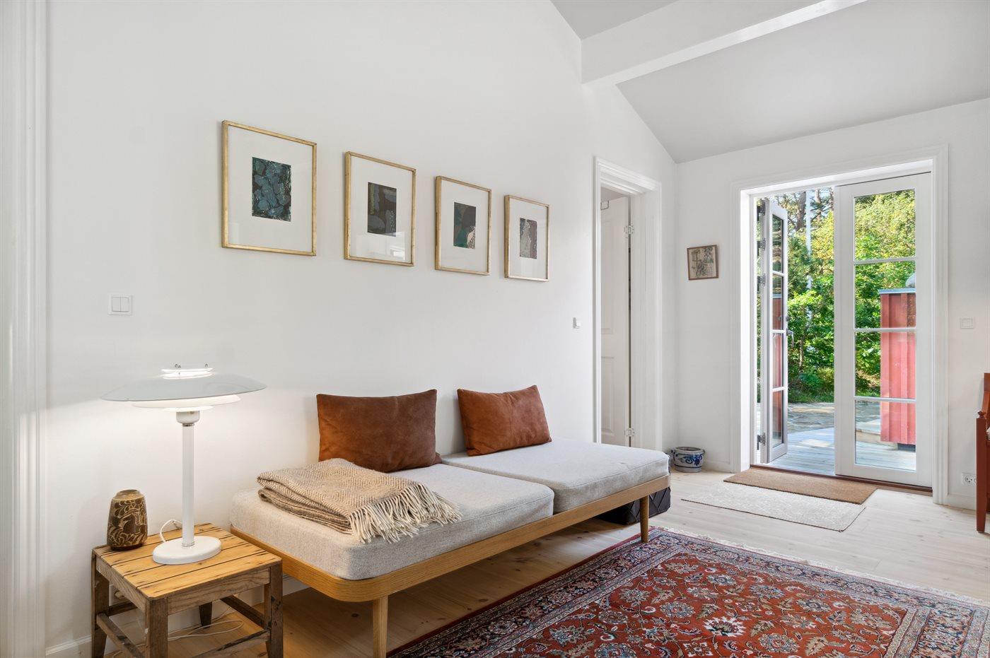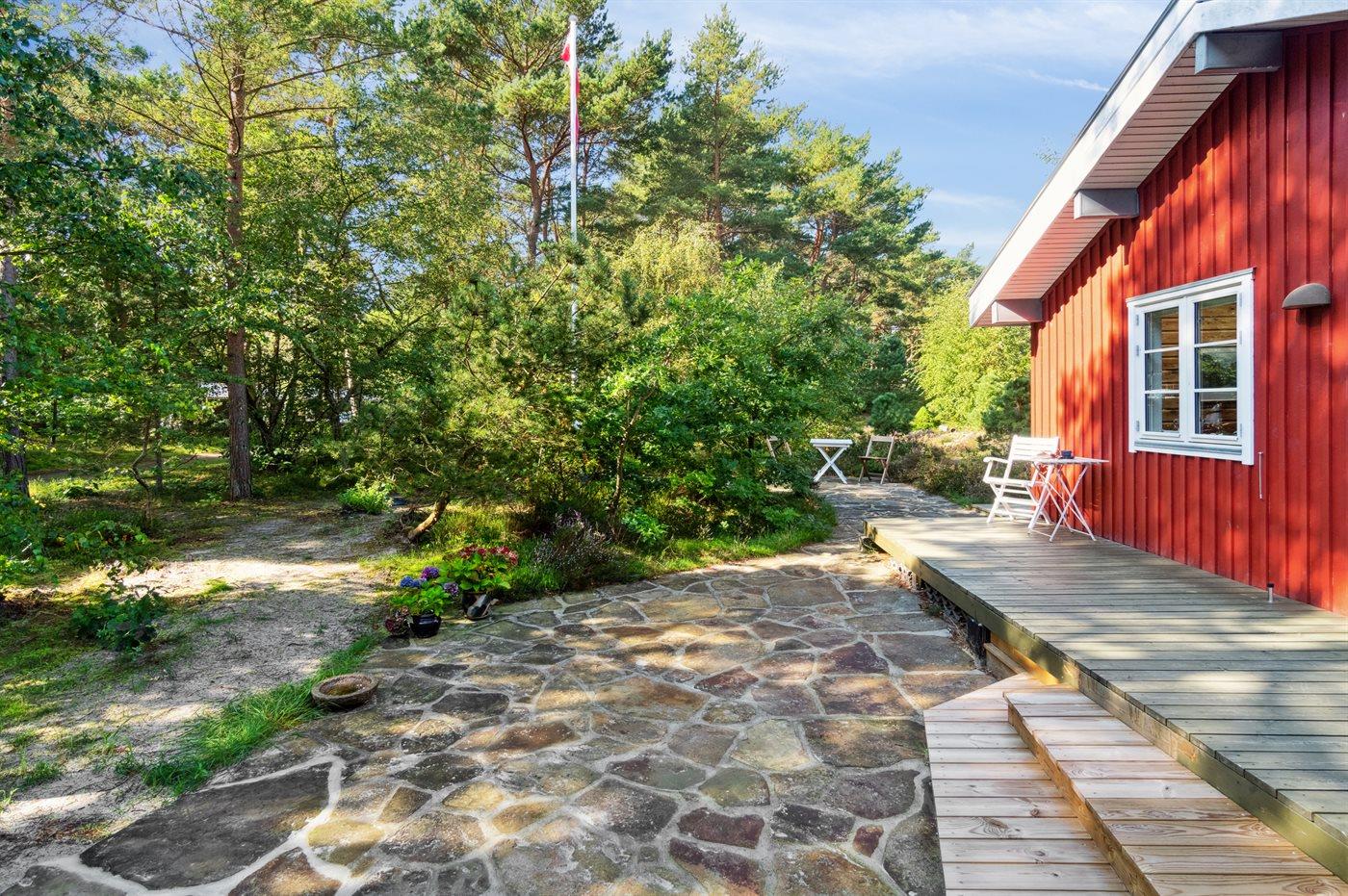 Ejer bor selv i hovedhuset, men husene er adskilt på den måde, at der er egen indgang og egen P-plads til huset. Indvendig er huset indrettet indbydende og fremstår virkelig vedligeholdt og pænt - fra stue er der udgang til dels en træterrasse og dels en sandstensterrasse med havemøbler, så man kan nyde den flotte lyngbevoksning i den let kuperede naturgrund. Lyse vægge og lofter i kip og virkelig flotte lyse trægulve fuldender fornøjelsen af at være i et moderne feriehus.